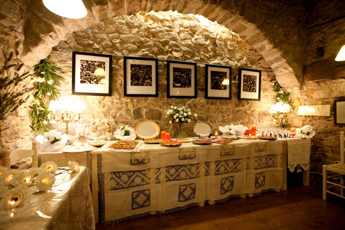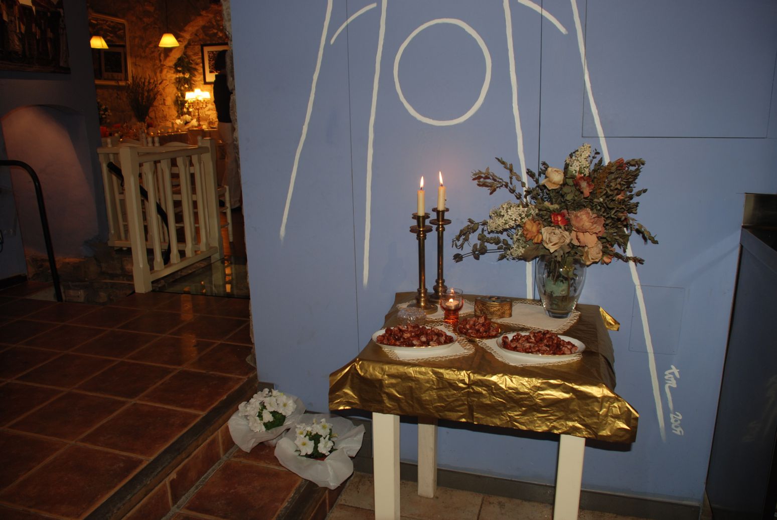 Un raconet per servir-se ametlles garrapinyades. Damunt un paper daurat hi reposen platets de vidre amb les ametlles. Dos canelobres, també daurats, i un bonic ram de flors, posades dins un gerro de vidre, completen el conjunt.
