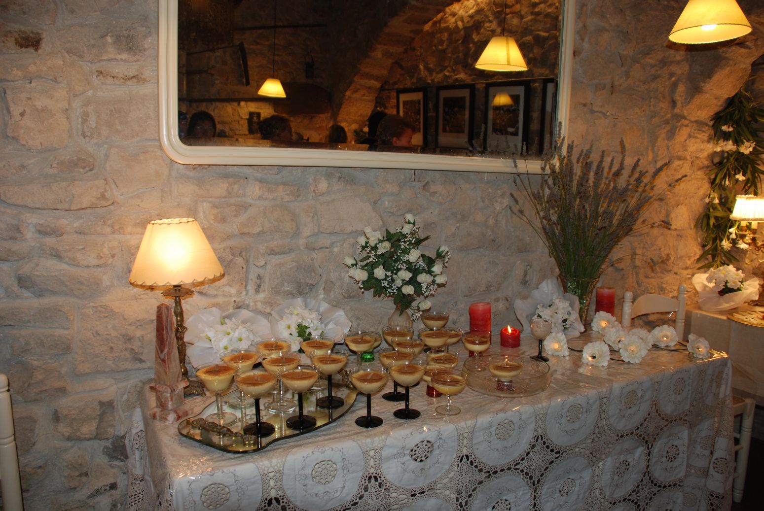 En una taula disposada sota el mirall i coberta amb unes estovalles molt treballades s’hi presenta tot un conjunt d’antigues copes de vidre, amb peu negre, plenes de crema catalana. Espelmes, un ram de flors i un altre d’espígol acaben de completar la decoració d’aquesta zona dedicada a les postres i il·luminada amb una garlanda de roses blanques i un llum amb pantalla de pergamí.