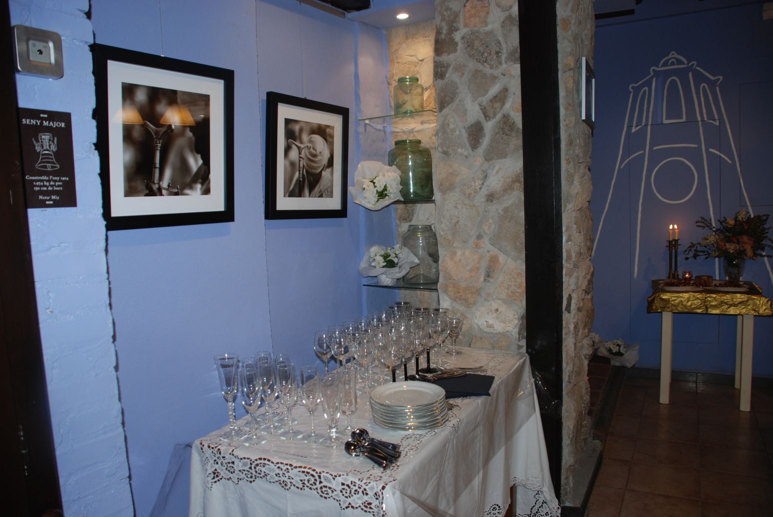 Damunt una mantelleria blanca, molt treballada, s’hi presenten els plats, les copes, de diferents mides i formes i els coberts. Un parell de flors blanques embolicades amb paper de seda embelleixen el racó on hi ha exposats uns recipients de vidre fets a mà.