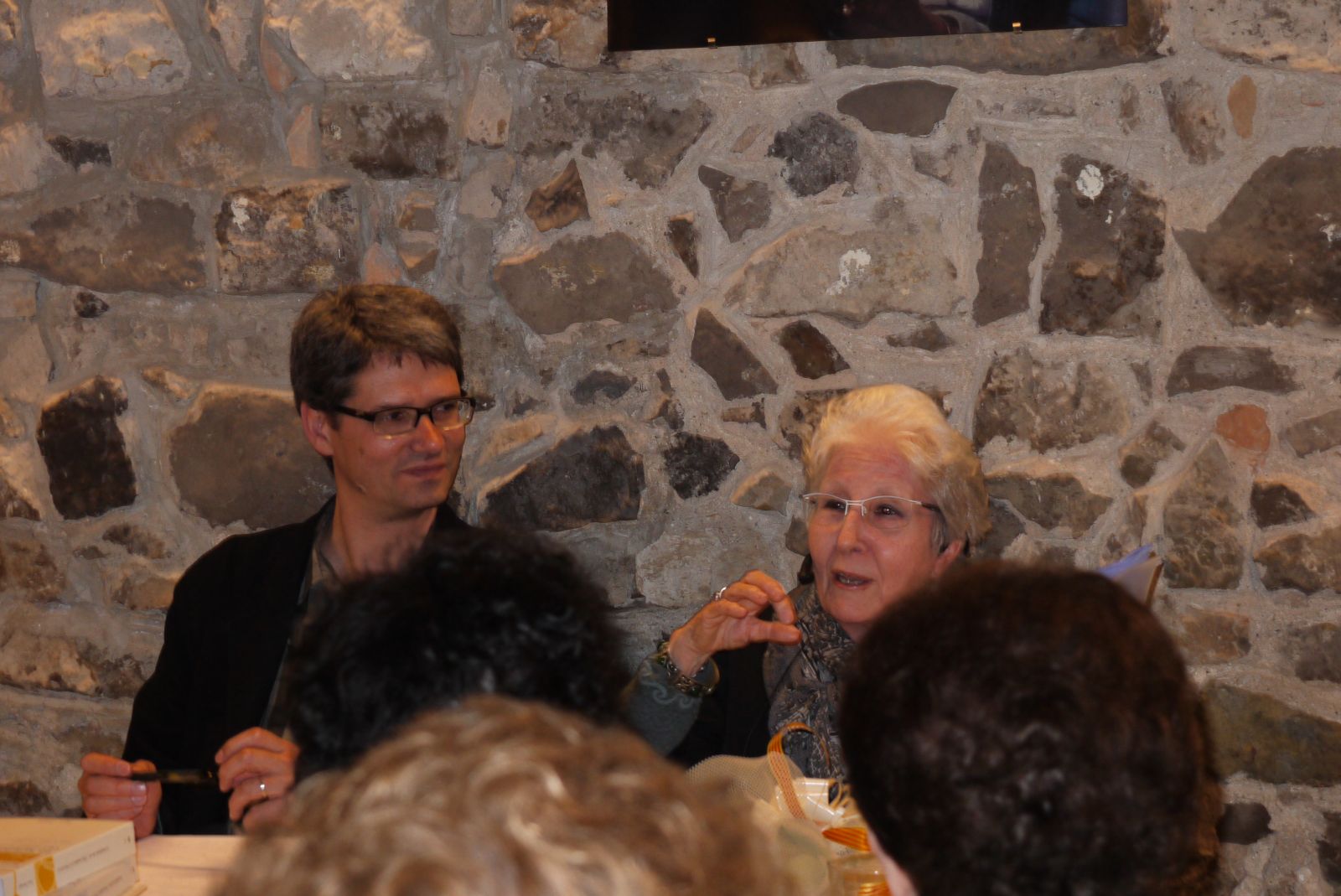 Albert Turull l’acompanyà i ens parlà tant de la vessant professional, Rosa és farmacèutica, com de la seva trajectòria com a escriptora. Va fer una excel·lent explicació seqüenciant els llibres que ha anat publicant al llarg dels anys. Tenint en compte que la poesia ha estat molt important en la vida de l’autora, que va néixer i va viure a Cervera fins els set anys, vam tenir el plaer, un cop acabada la conferència que portava per títol: Rosa Fabregat, una cerverina entre la literatura i la ciència, d’escoltar un petit recital de poemes.