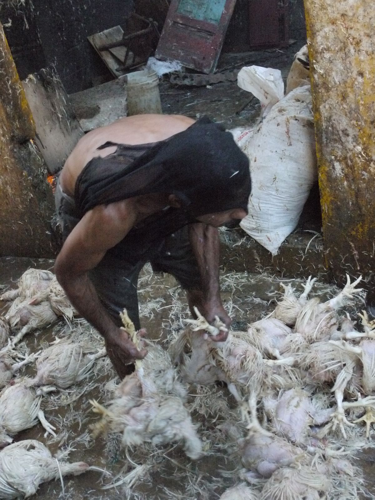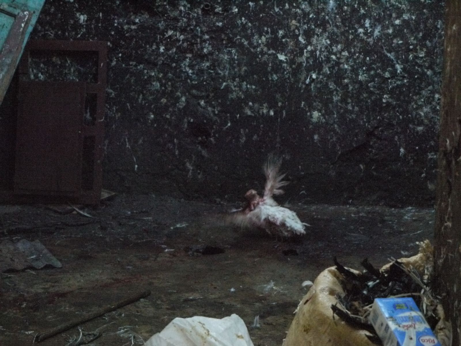 Ens trobem al costat d’on hi ha la parada de pollastres o sigui que l’espectacle no és privat. El jove, tot i escoltant música, va tallant el coll als pollastres, l’un darrera l’altre. El seu company és a dins d’aquest cubícul infecte.