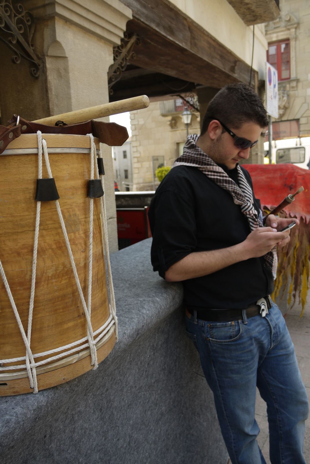 El Pau, un conegut i eixerit jove cerverí, molt vinculat amb el món de la música, i també component d’un dels grups de grallers, està esperant pendent del mòbil…