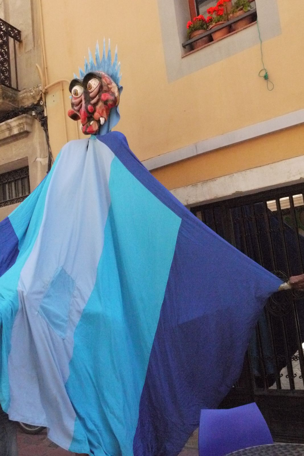 Toc de Vermut i la Cercavila amb grallers, cuques i titelles. Davant “el Campanar”, la Titella Blava…