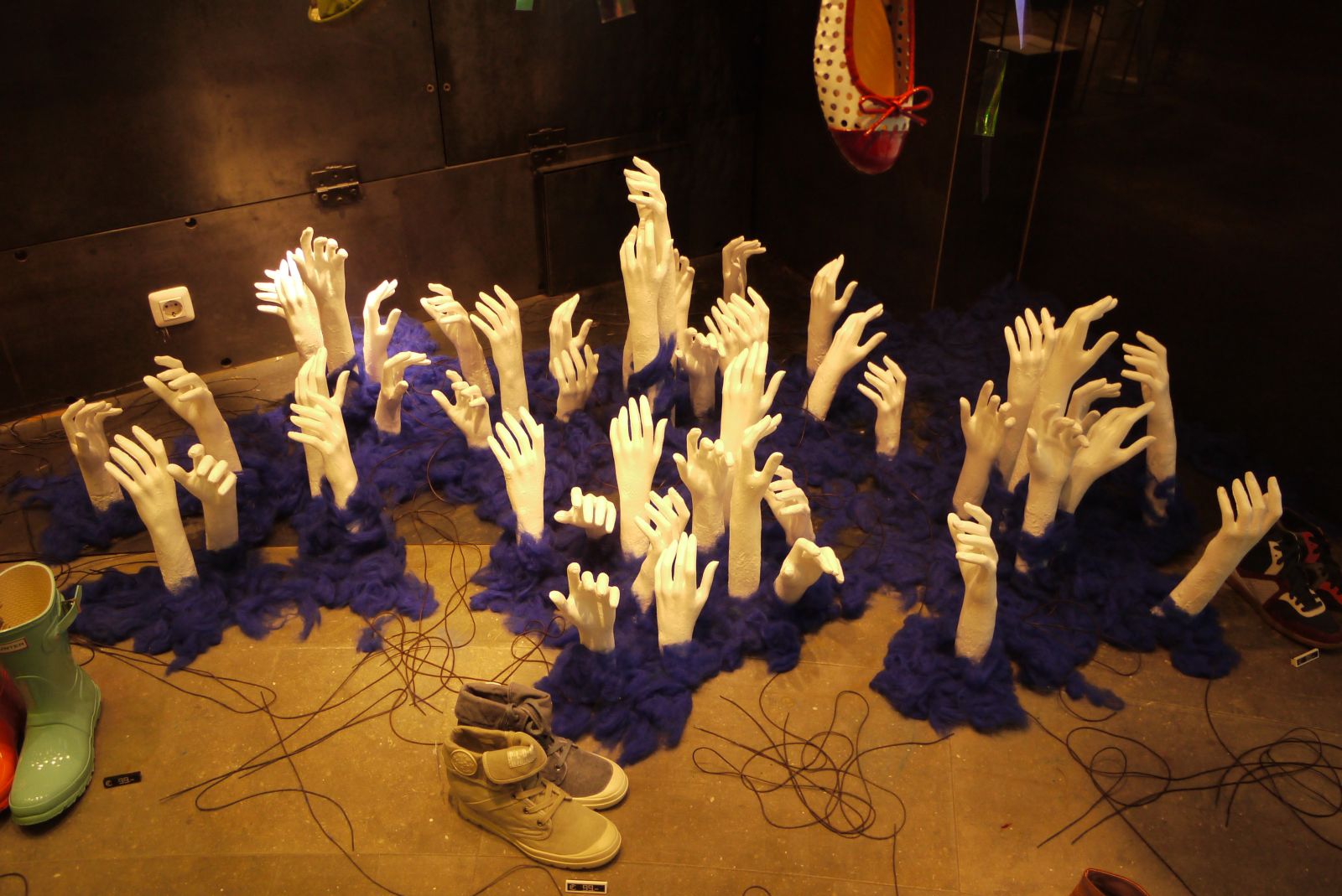 I dels ulls i els llums passem a una altra part del cos, les mans. Mans que surten d’uns màgics núvols blaus i que s’enlairen per agafar l’element amb que cal vestir els peus, sabates i més sabates.