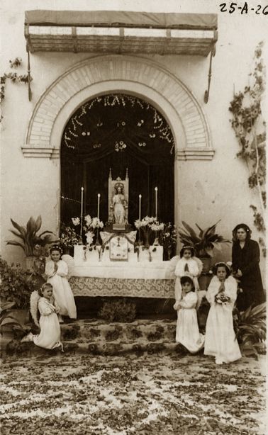 La solemnitat i pompa d’aquesta sortida de la processó de Corpus contrasta amb la nena, que es veu agenollada a la dreta de la imatge, i que dóna la impressió que és la imatge de la pobresa.