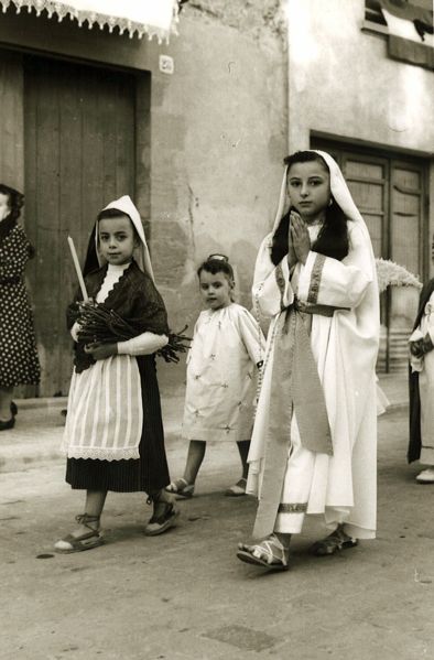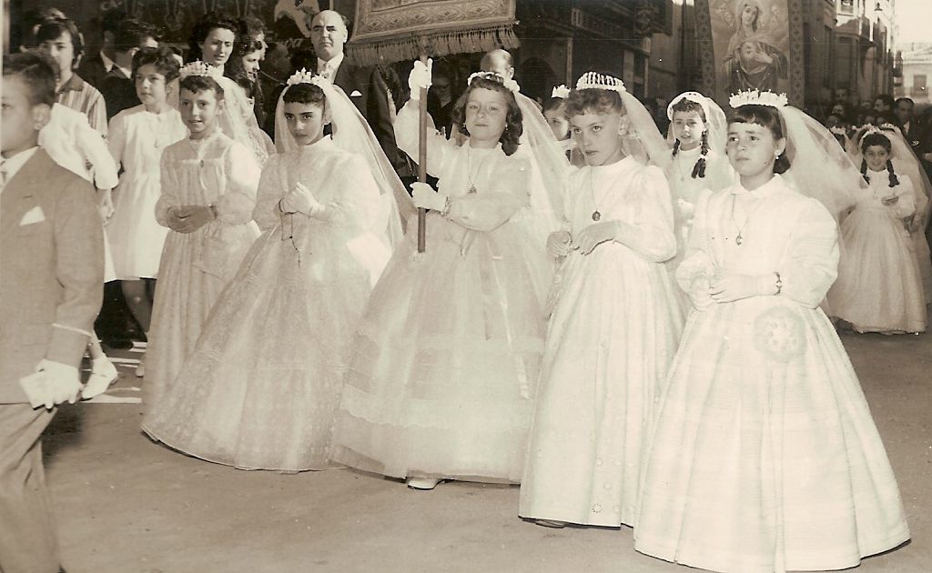 Nenes vestides de comunió, d’esquerra a dreta, Mª Dolors Vergés, Mª Tresa Pallàs, Victòria Fusté, Ramona Calafell i Maria Rius.