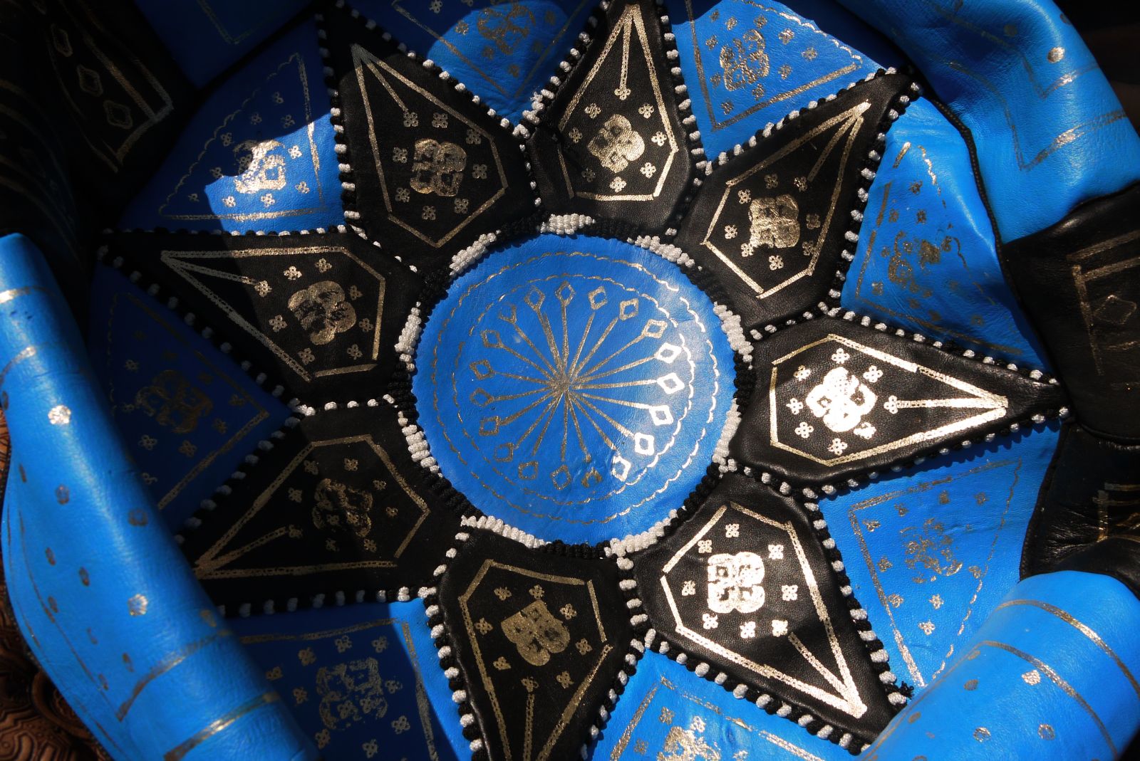 Un coixí de pell, tenyida en negre i blau, continua aportant color a aquests objectes d’artesania popular.