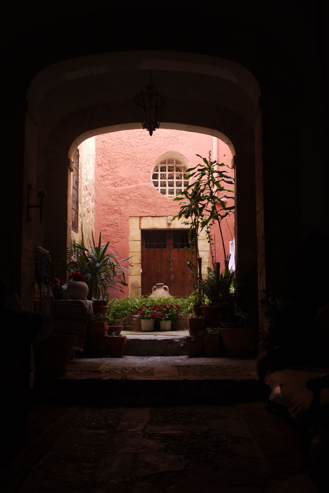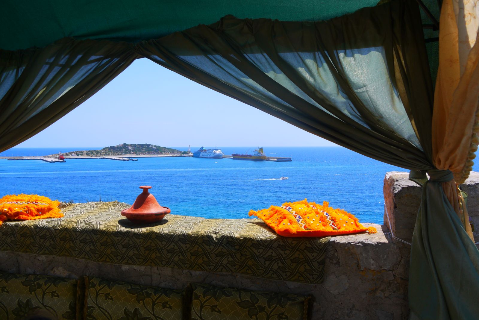 Aquest racó, que fa de balconada oberta al mar, queda molt viu amb les pinzellades d’aquests coixins taronja que contrasten amb el blau lluminós del Mediterrà.