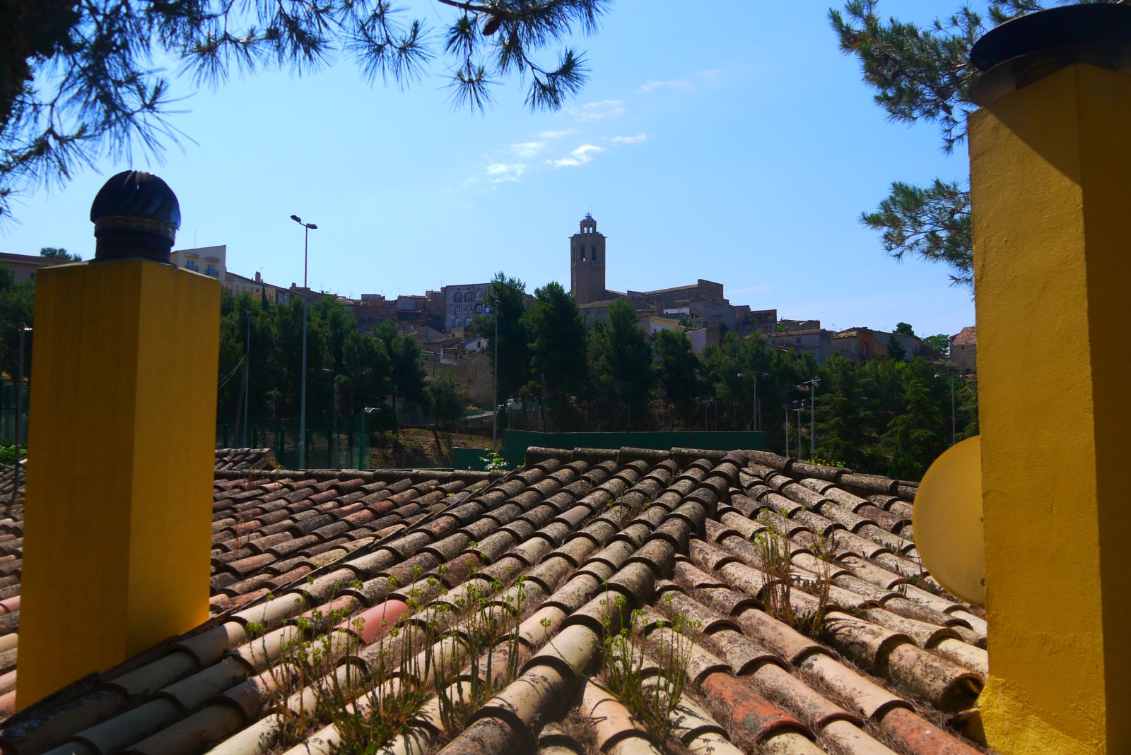 Passant pel caminoi de darrera la cafeteria les xemeneies s’aixequen en vertical volent jugar a fer paral·leles amb el Campanar. Aquestes herbetes que hi ha donen un aspecte entranyable en aquest conjunt tan geomètric, on les teules de tota la vida, protagonitzen el primer pla.