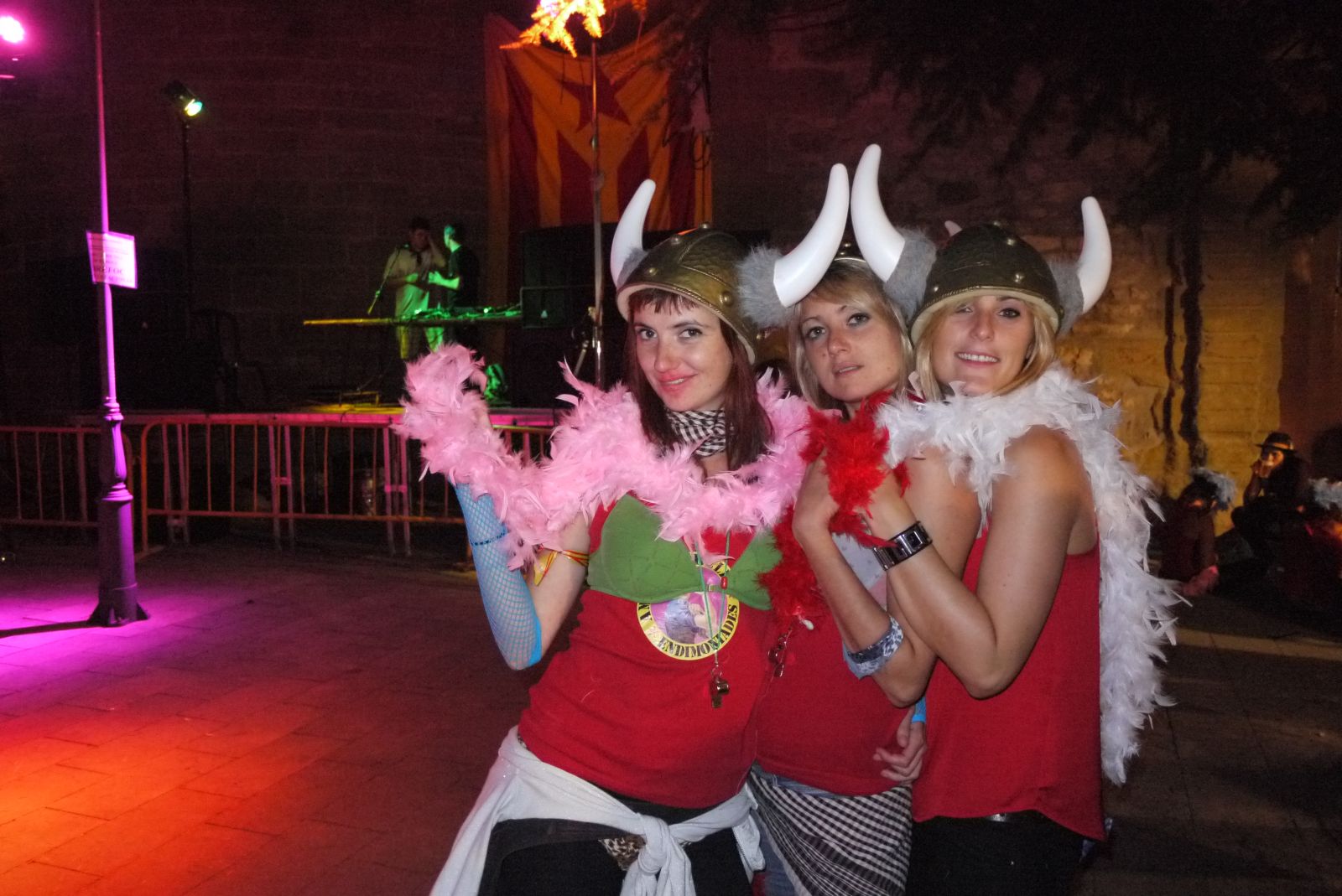 Mentre a la plaça Major la gresca continuava, la plaça del Fossar s’acabava de preparar per rebre la gent. Aquesta nit n’era la protagonista i es va mudar tal com calia. Una estelada fa de fons a aquestes joves vikingues que van ser de les primeres en arribar a aquest espai.