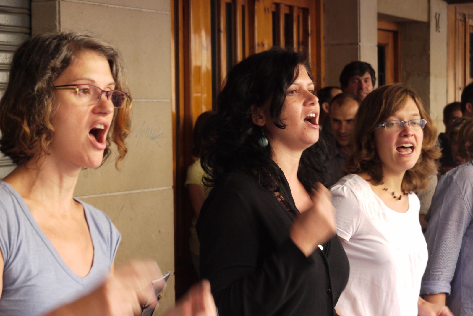 Les Mezzos, en la primera part del concert, antuant sota els porxos de la plaça.