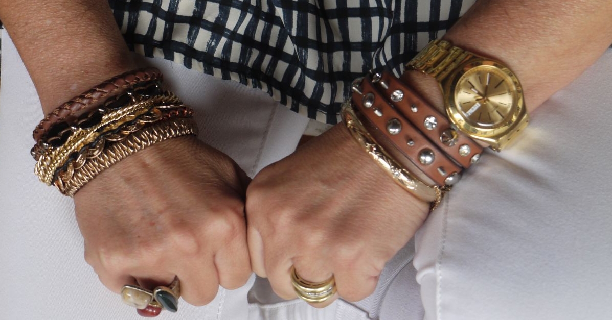 Polseres amb tanca imantada del mercat de Les Dàlies, Eivissa, rellotge Swatch amb acabat daurat, polsera de cuir natural amb tatxes, d’una tenda d’Eivissa i esclava antiga. Anell amb tres pedres de Bimba y Lola.