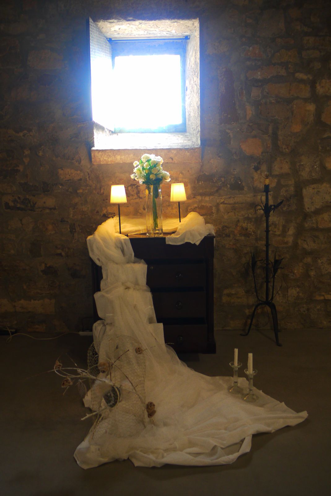 Un glop intens de llum ens desdibuixa els contorns d’aquesta composició. Un moble vestit de núvia amb la incorporació d’un sorprenent element decoratiu, un reixat de galliner que fa de suport a unes flors. De seguida sabrem el protagonisme que tindrà aquest senzill material en aquest espai.