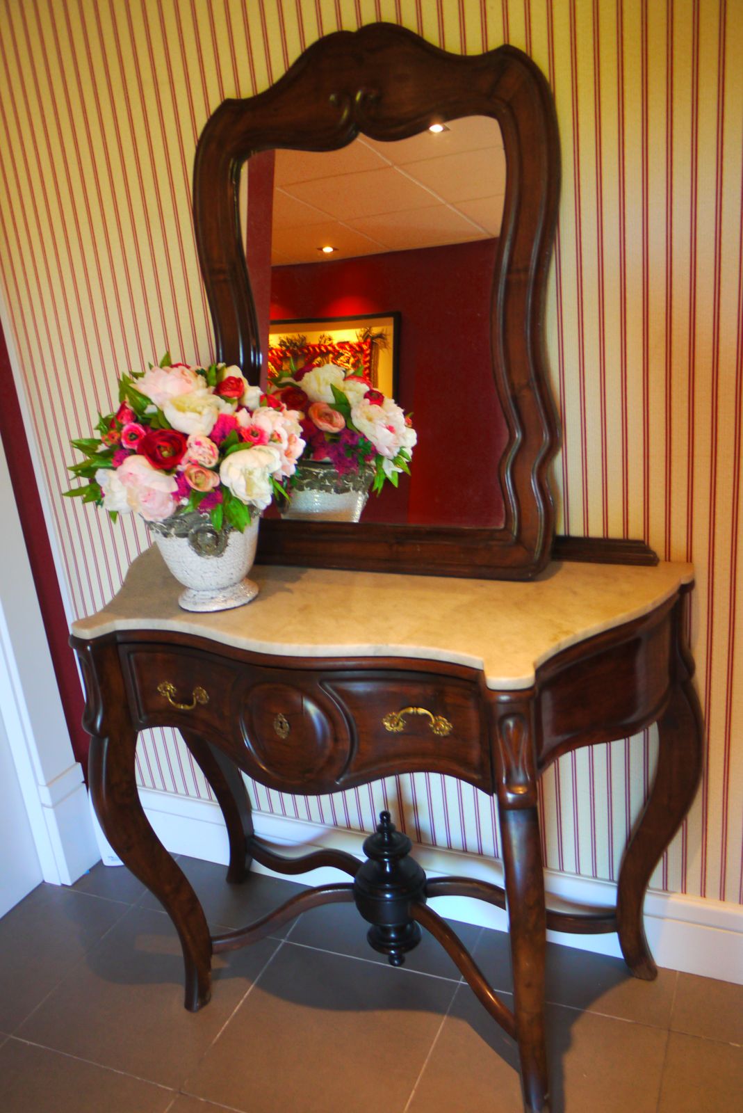 Aquesta zona per la que s’accedeix als banys l’ha decorat a l’estil anglès. Cretones i teles ratllades donen el contrapunt a uns mobles de fusta noble que fan costat a una agosarada combinació: una catifa marroquí, emmarcada, que s’integra perfectament en aquest ambient.