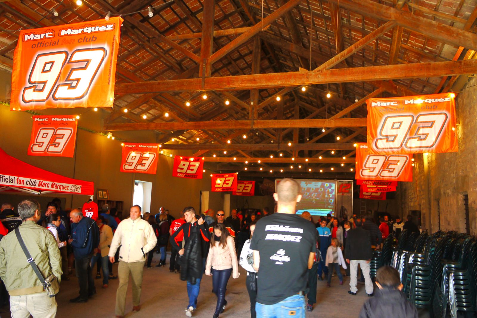 Aquesta sala, amb un sostre perfectament restaurat feia molt goig. Ambientada amb banderoles de l'”official club”, va quedar plena de gom a gom pels seguidors de Marc que, emocionats, veien com es desenvolupava la cursa. A l’exterior, els responsables de Bona Teca, atenien als nombrosos clients oferint un servei d’esmorzars i begudes.