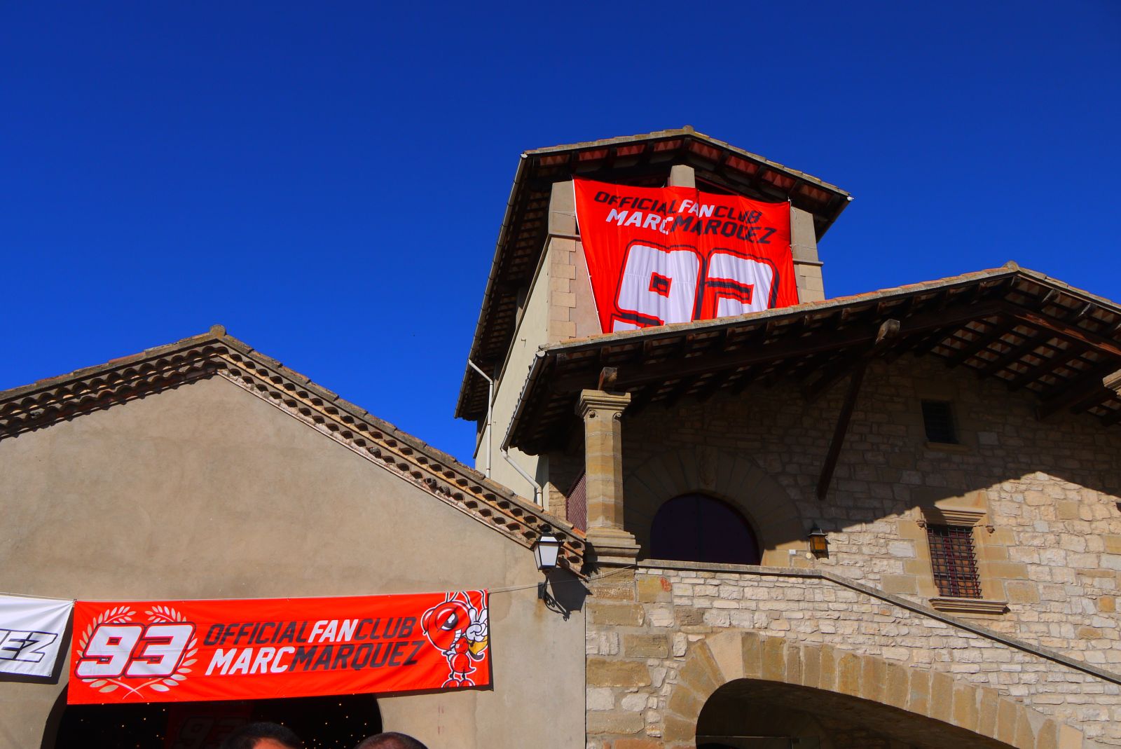Les fotografies que veureu ara estan fetes diumenge passat, en una jornada de portes obertes, ja aquest edifici rebia a tothom en motiu de la concentració de seguidors del Marc Márquez. Els seus fans es van trobar amb aquest cartell de benvinguda. Dins una sala molt espaiosa, unes 300 persones es van aplegar davant una enorme pantalla, veient les imatges de la cursa.