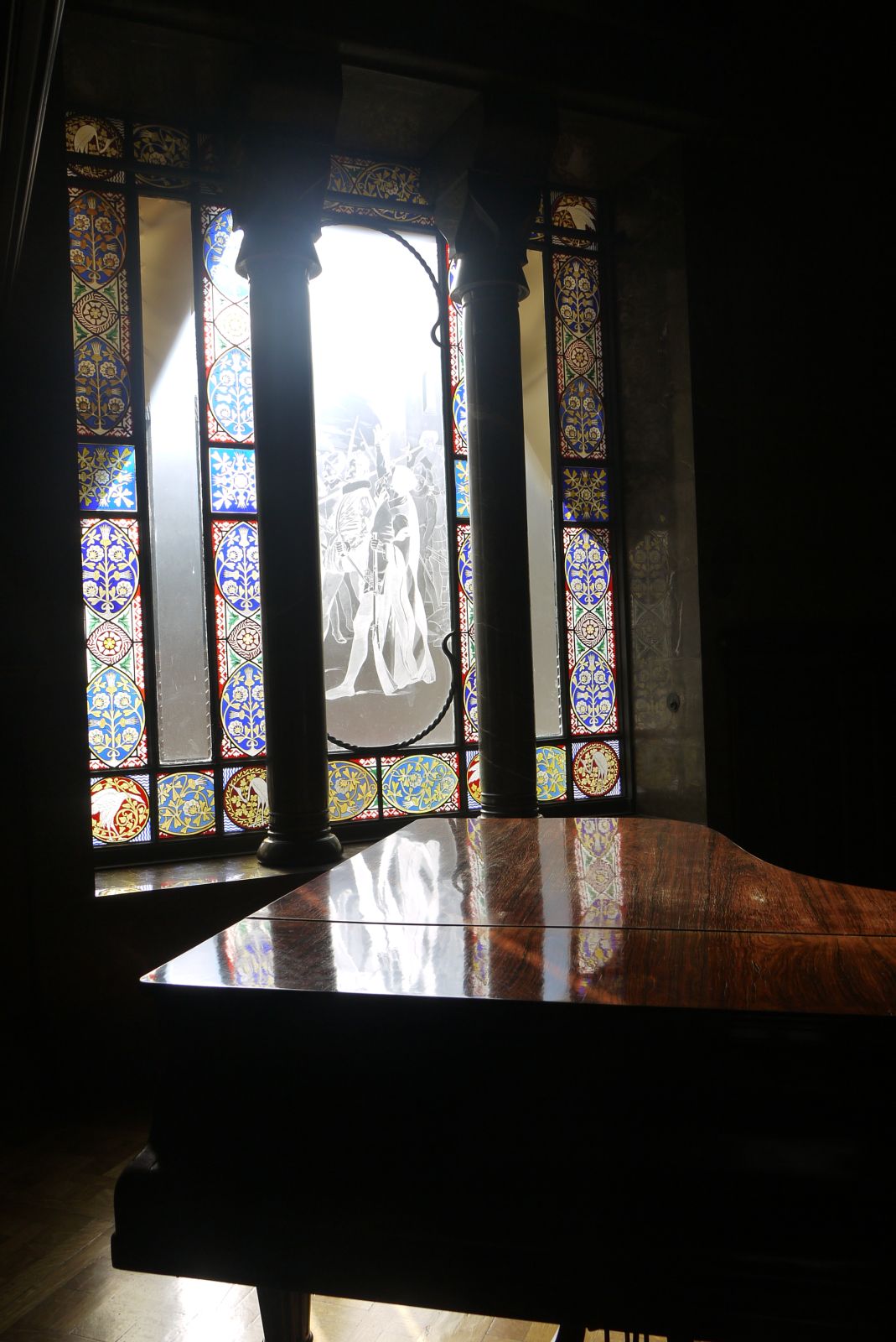 La sala de música amb el piano que recull el reflexe dels colors de la vidriera.