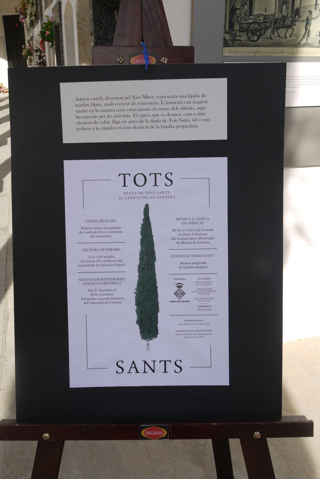 Aquest cartell dissenyat per Xavi Miret representa una làpida de marbre blanc en la que cadascuna de les activitats que s’anuncien estan posades d’una manera semblant a com s’anaven posant els noms dels morts damunt el marbre. El xiprés, que es destaca com a únic element de color, lliga els actes de la diada de Tots Sants, tal i com trobem a les làpides el nom de la família propietària.. Un bon disseny que ens mostra una part artística acompanyada d’un missatge molt encertat.