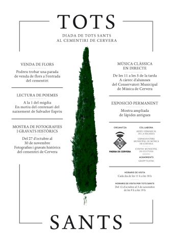 Mai m’hauria passat pel cap que faria un post sobre el cementiri de Cervera però m’he adonat que valia la pena que quedés constància de tot el que s’havia programat al voltant de la festa de Tots Sants. Els responsables del cementiri han sabut organitzar una sèrie d’activitats que, com s’ha fet en altres llocs, han reconvertit aquest espai, abans llòbrec i apagat, en un lloc agradable de visitar i molt proper. Recordem molts dels cementiris europeus als que la gent hi va molt sovint i en té cura, com si fossin jardins particulars.