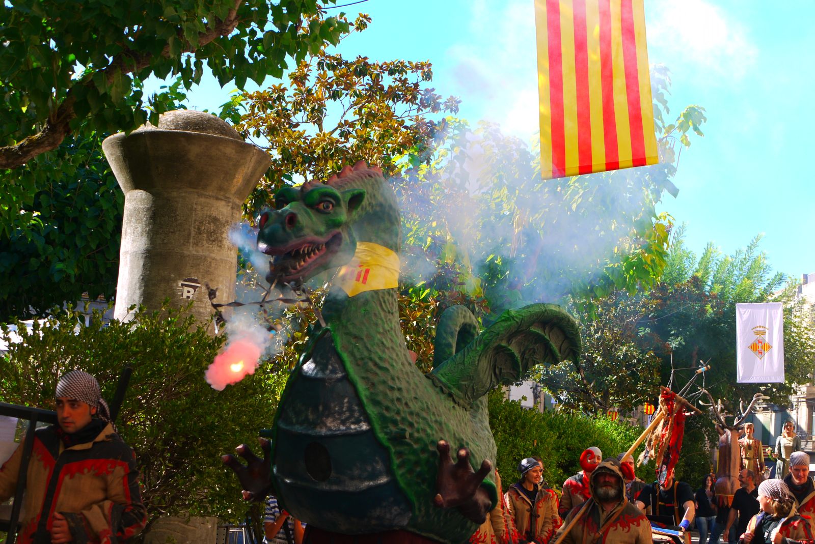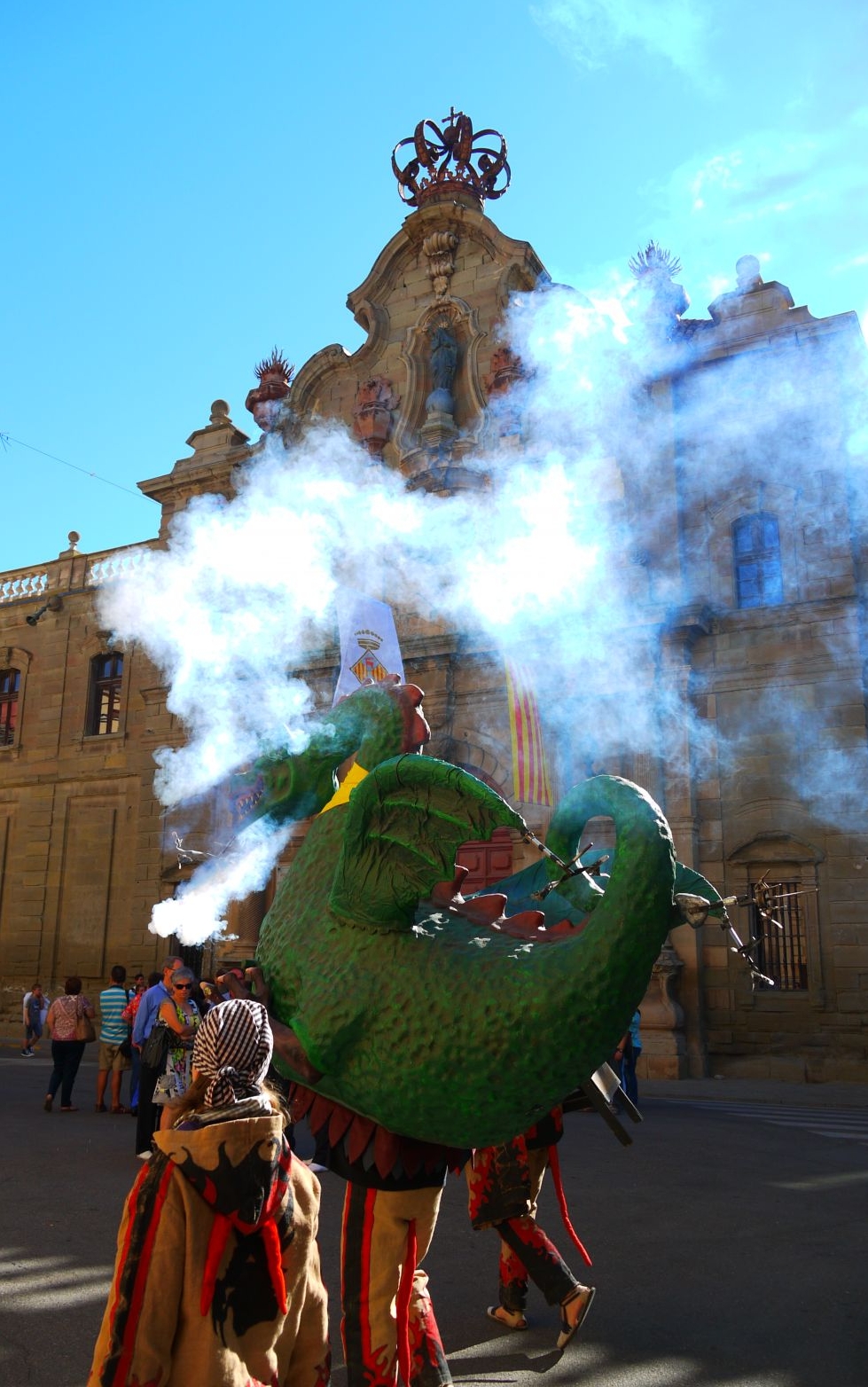 El Drac lo Carranco Bilandó, acompanyat dels Diables de Cervera, va deixant un rastre de fum al seu pas.