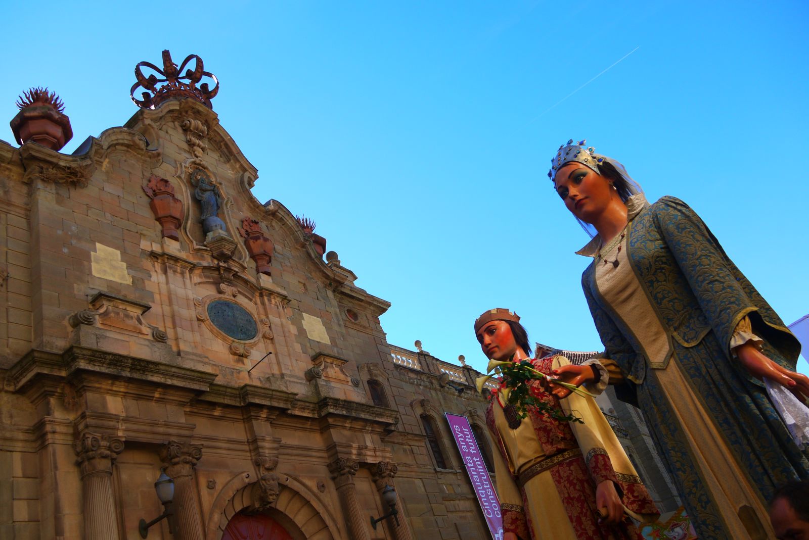 Els Gegants vells de Cervera, flanquejats pels Geganters.