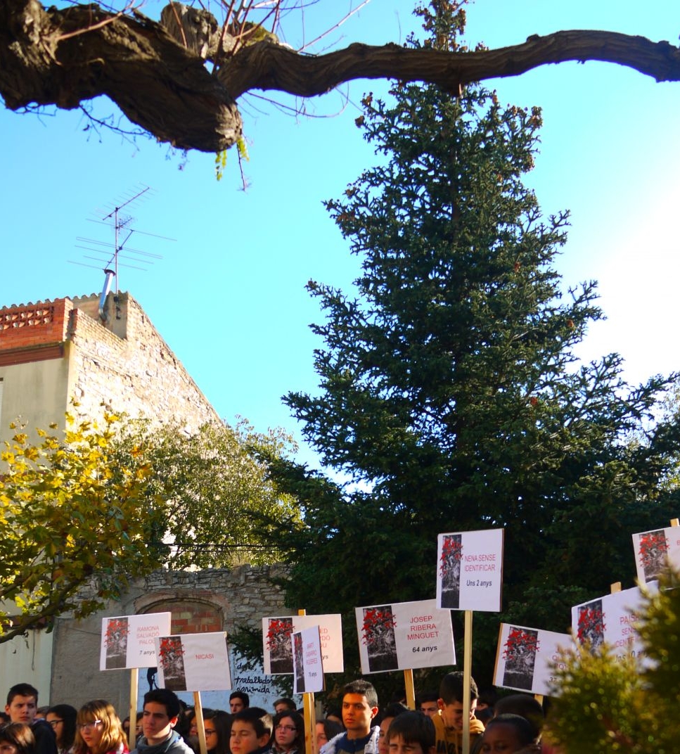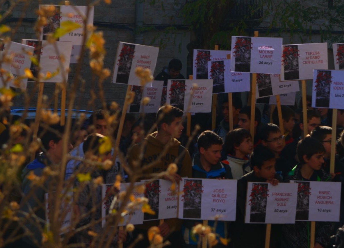 Un grup d’alumnes portaven pancartes en les que hi havia escrit el nom de cadascun dels morts que hi va haver en aquest bombardeig.