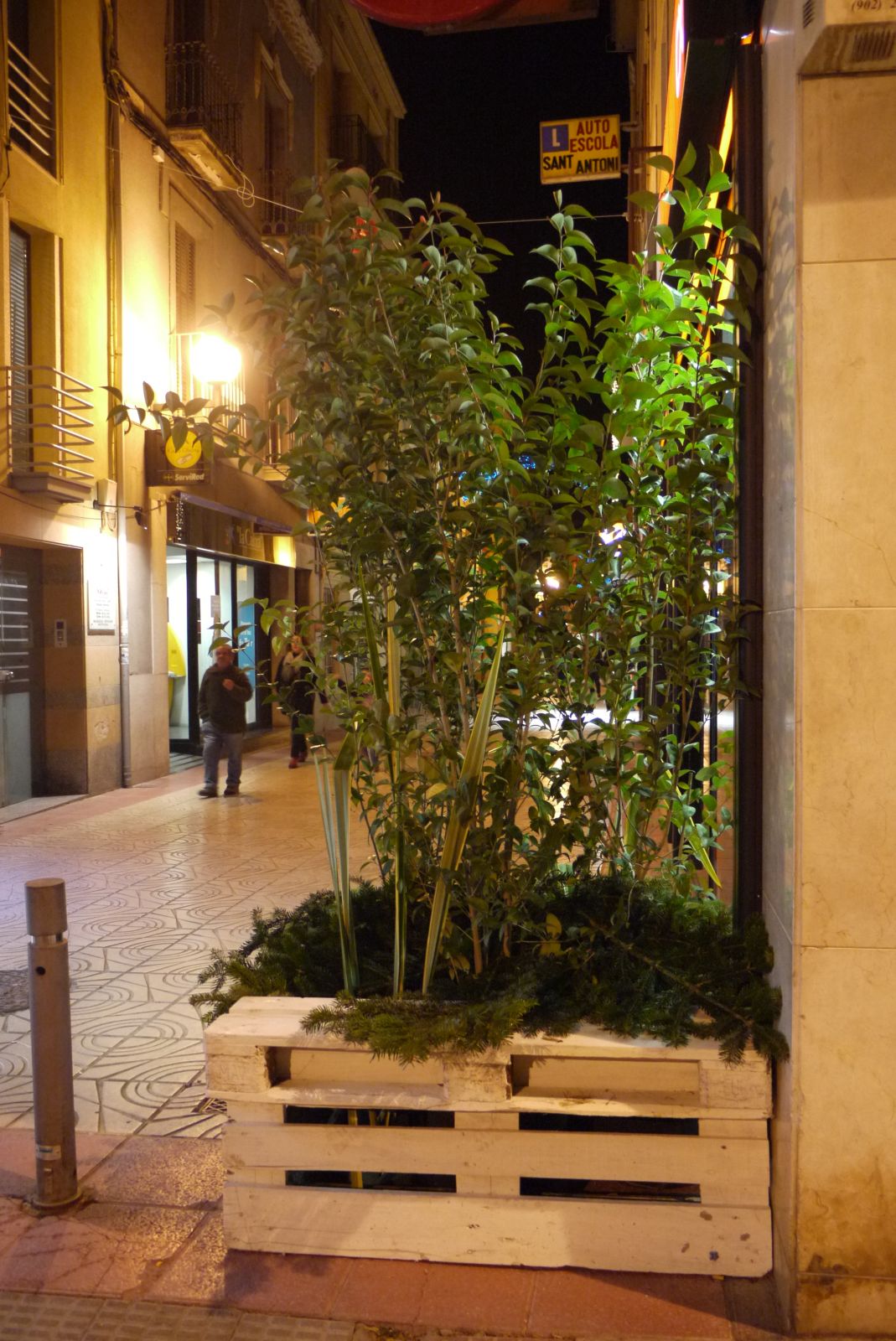 El Marc ha tingut cura de la decoració del carrer Combat i l’ha encertat del tot. Unes caixes de fusta de grans dimensions contenen un conjunt decoratiu amb elements vegetals de diferents tons de verd. Sembla que hi haurà sort i potser costarà més de fer-ho malbé com acostuma a passar cada any.