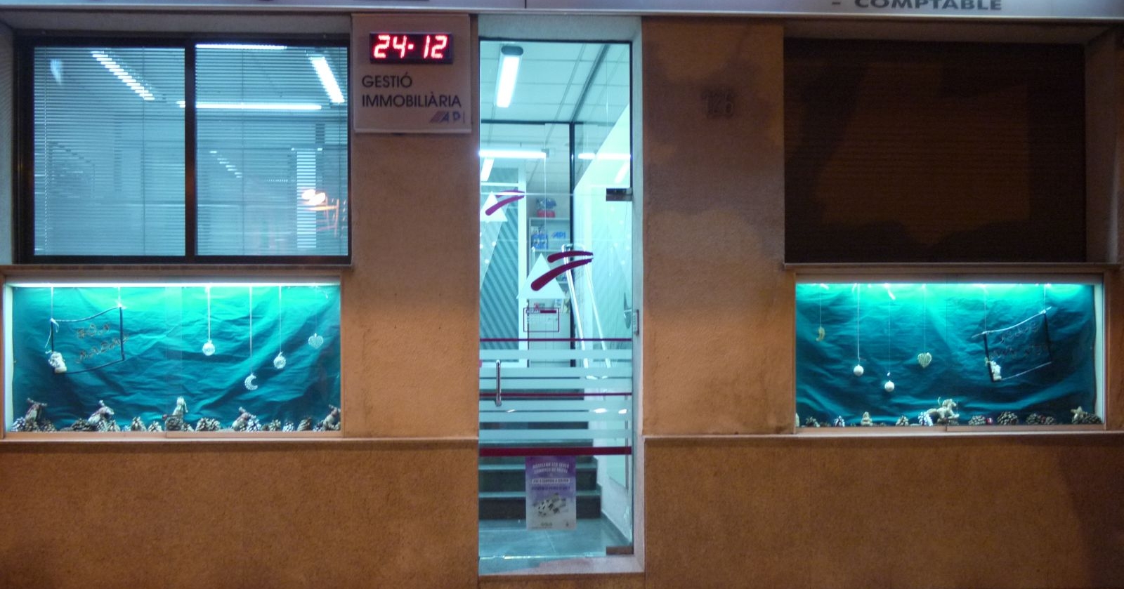 Finques Fumás ha aprofitat els seus dos aparadors per fer un muntatge que s’assembla als fons marins. Amb aquest color tan bonic, els elements decoratius que s’hi presenten, donen la impressió que flotin dins l’aigua. De nit, amb la llum, resulta màgic!