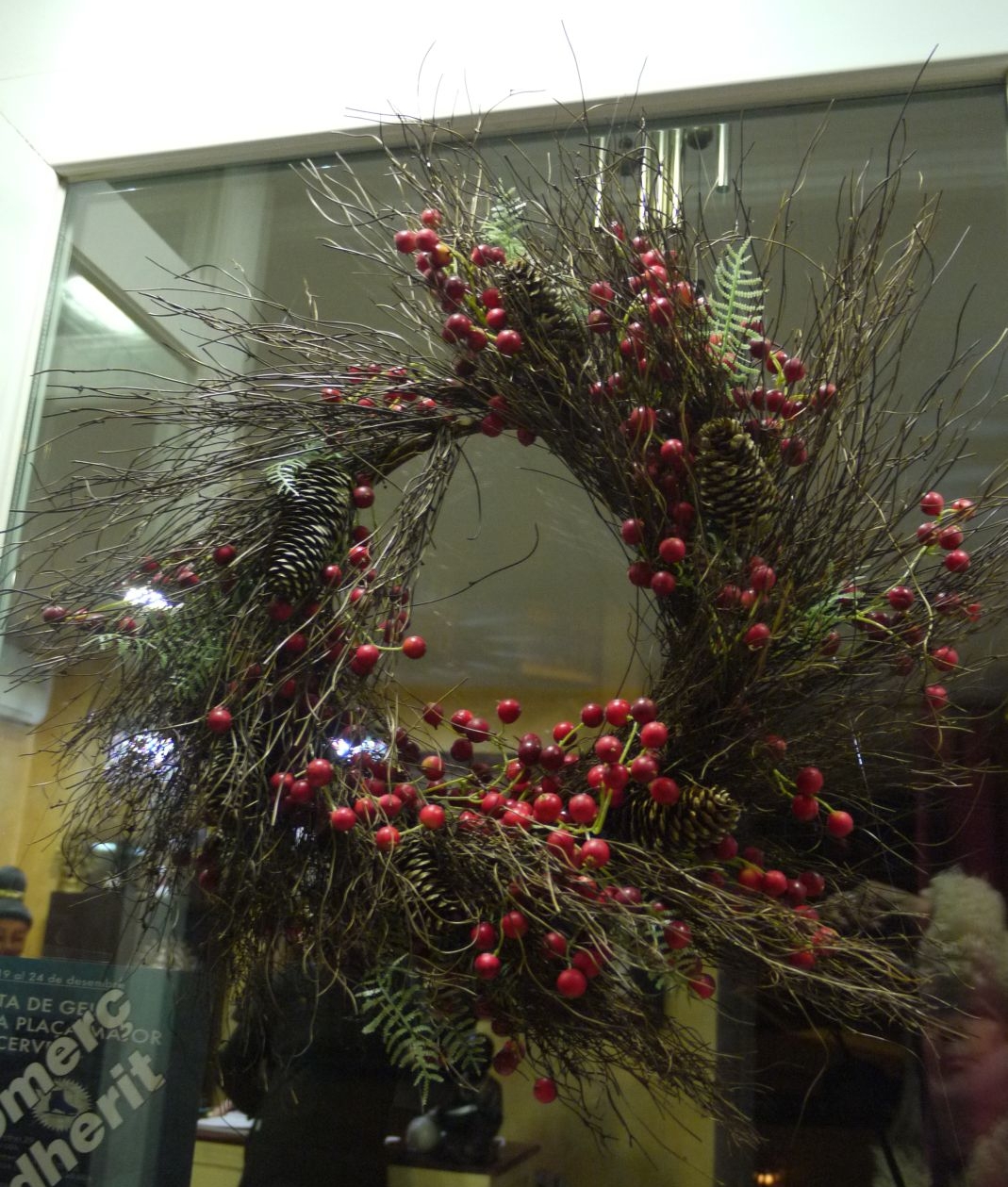 Una corona, preciosa, embelleix la porta de l’establiment donant la benvinguda als clients. Feta amb elements molt naturals que podem trobar al camp dóna una fantàstica idea per copiar i fer-se amb una peça decorativa d’èxit.
