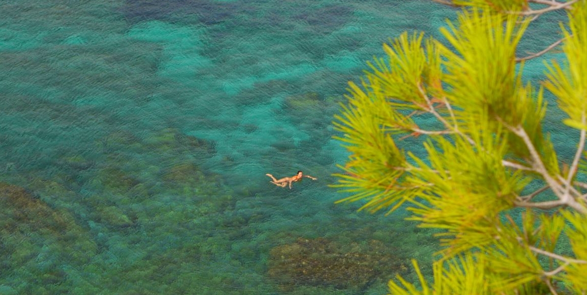 El jove, acompanyant de la noia, també alleugerat de roba neda cap aquesta paret de pedra.