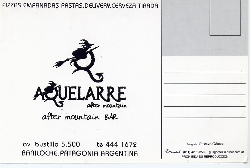 Ara ve la sorpresa! Fa tres anys a Bariloche, davant d’un dels llacs més macos que he vist mai, el Nahuel Huapi, vam descobrir aquest petit i acollidor restaurant que ens va atraure pel seu nom: Aquelarre. Ens vam presentar i ens hi vam quedar a fer un àpat, tot i explicant als seus joves propietàris el significat que tenia aquesta paraula aplicada a una festa al nostre poble. Es van quedar bocabadats quan, ordinador en mà, van poder veure la nit del dissabte d‘Aquelarre a Cervera.