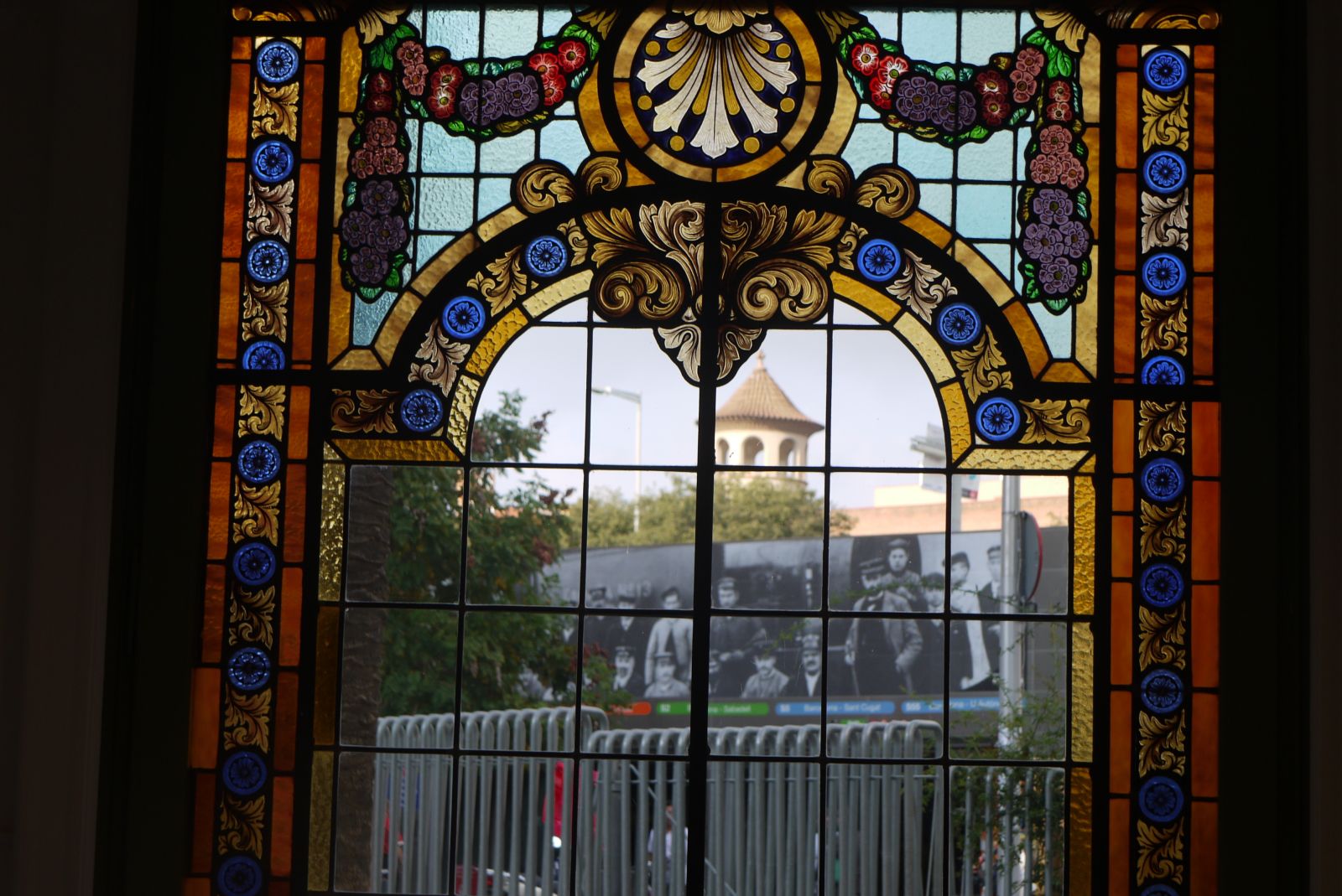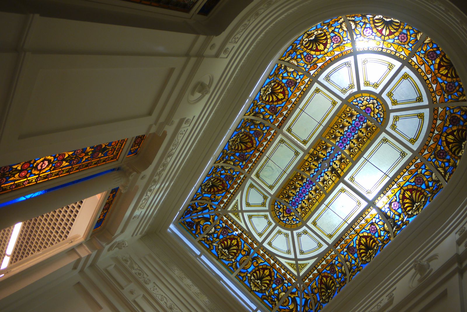 Una escala que queda il·luminada per aquesta claraboia coberta amb un vidre ple de colors que projecta una llum especial damunt la zona.