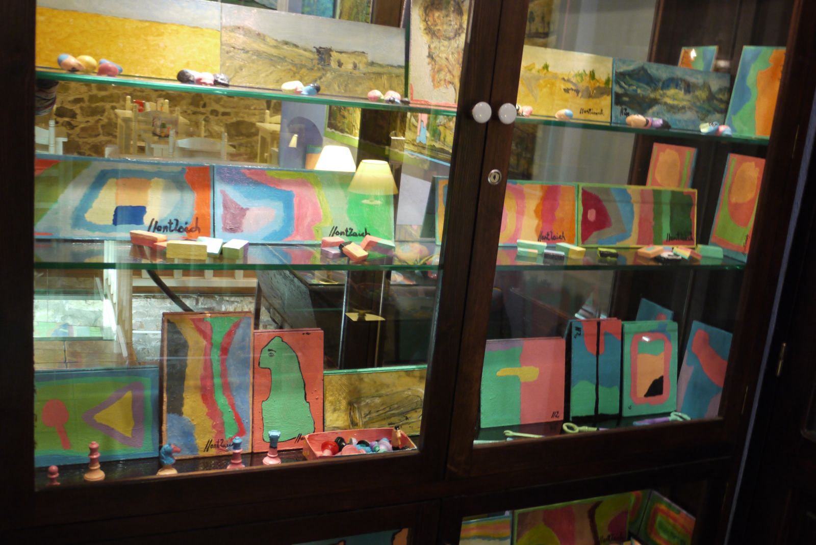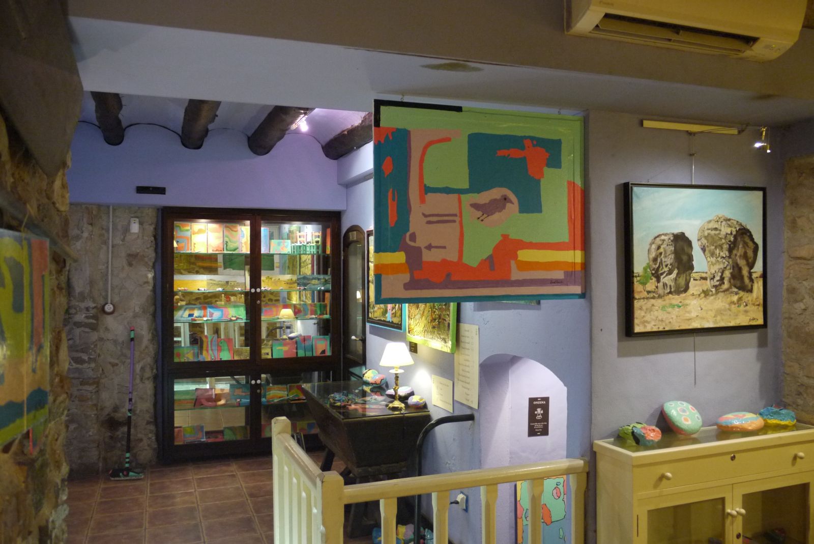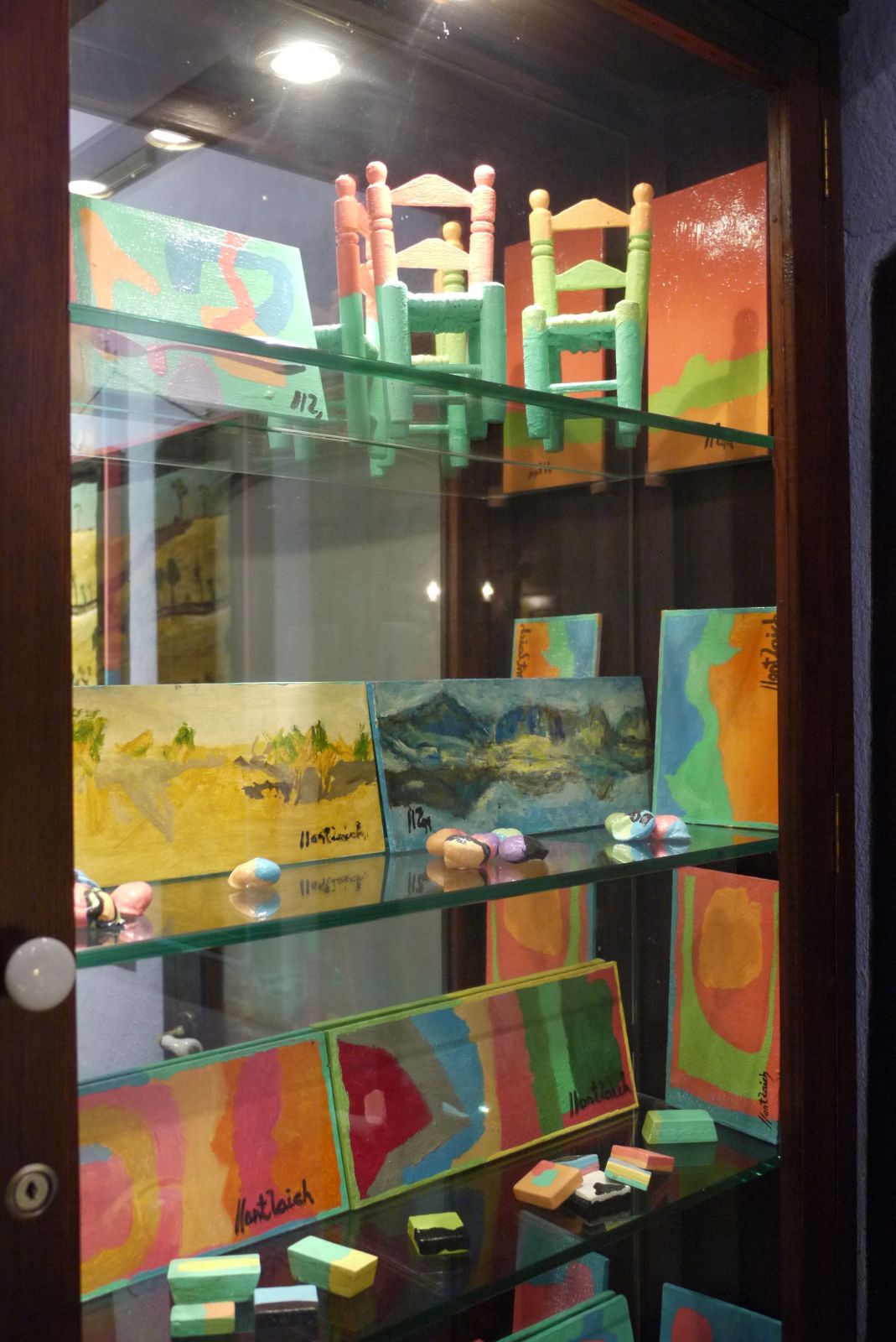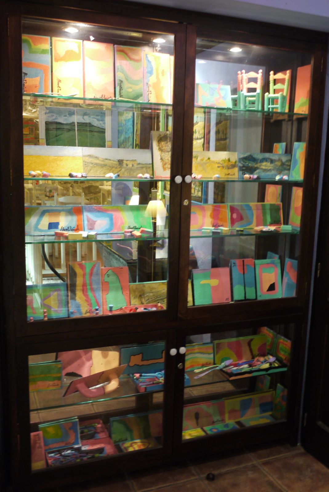 La vitrina ha quedat convertida en un espai ple de color. Tots els quadres de petit tamany acompanyats d’un grup d‘objectes: caragols, fustetes, claus, coberts…omplen amb tons alegres i vistosos els prestatges. Aquests quadrets estan pintats per les dues cares. En alguns d’ells, a les dues bandes s’hi pot veure pintura abstracta i altres, en una banda abstracta i a l’altra figurativa. En podeu comprar a un preu ben assequible. Els primers per 50 euros i els segons per 85 euros.