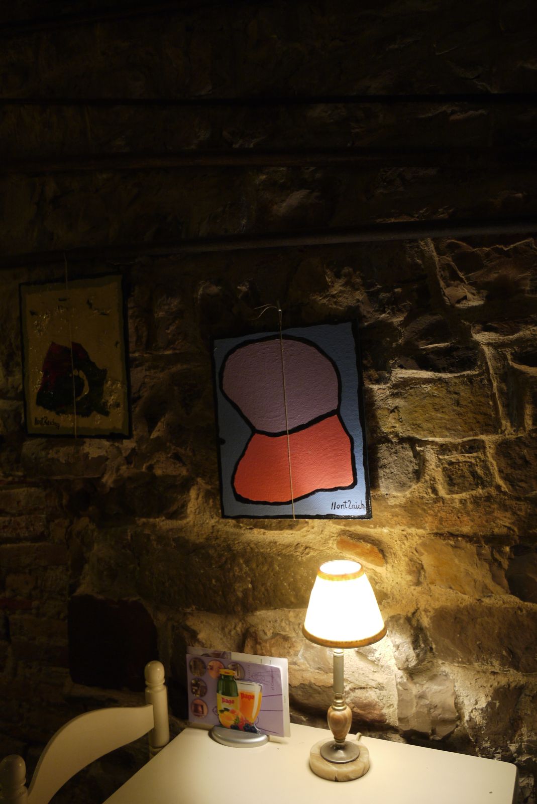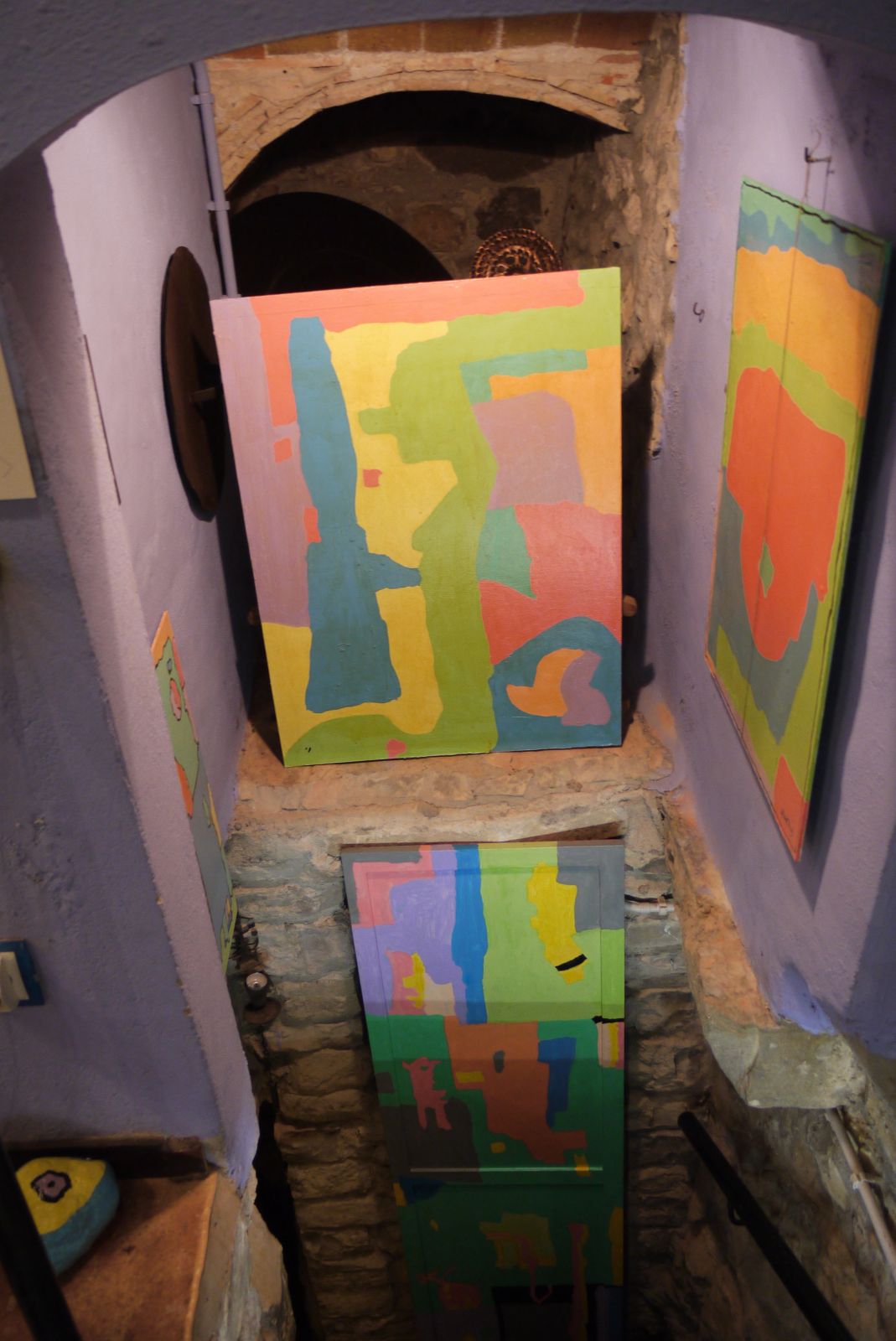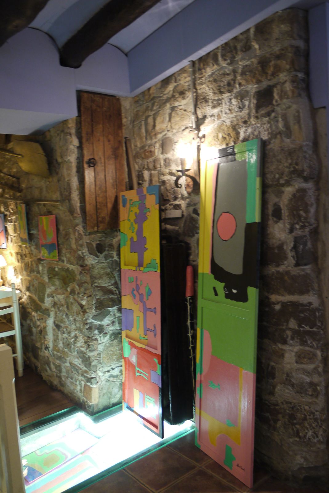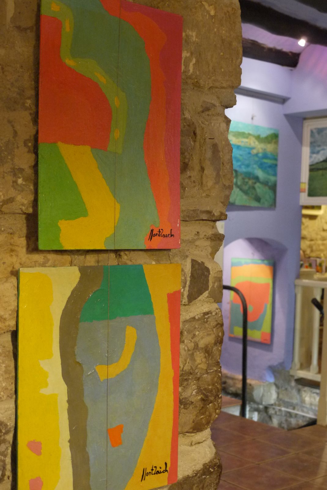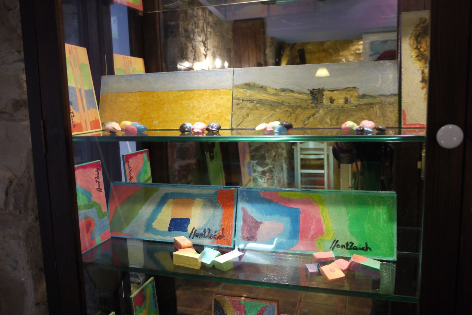 La vitrina ha quedat convertida en un espai ple de color. Tots els quadres de petit tamany acompanyats d’un grup d‘objectes: caragols, fustetes, claus, coberts…omplen amb tons alegres i vistosos els prestatges. Aquests quadrets estan pintats per les dues cares. En alguns d’ells, a les dues bandes s’hi pot veure pintura abstracta i altres, en una banda abstracta i a l’altra figurativa. En podeu comprar a un preu ben assequible. Els primers per 50 euros i els segons per 85 euros.