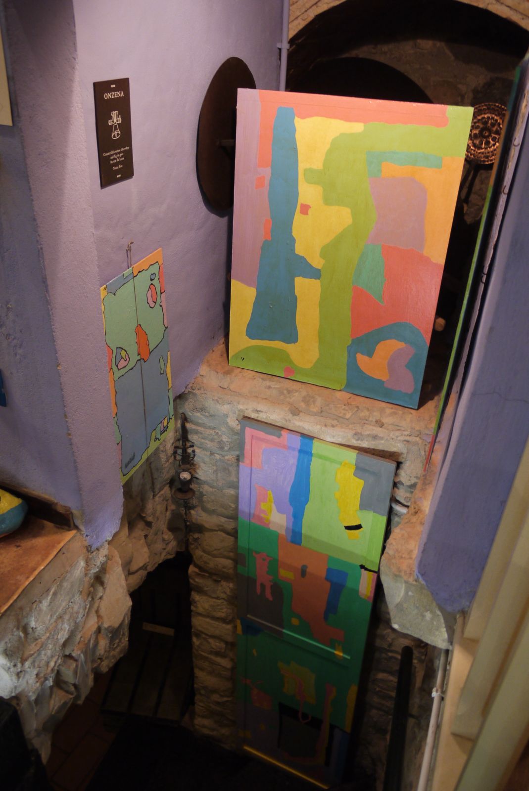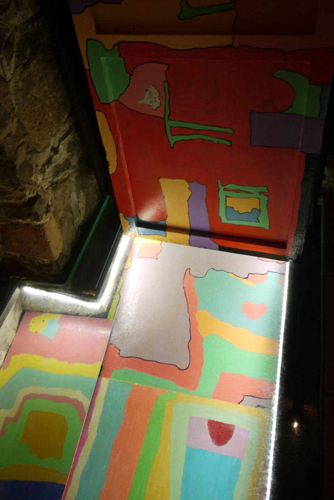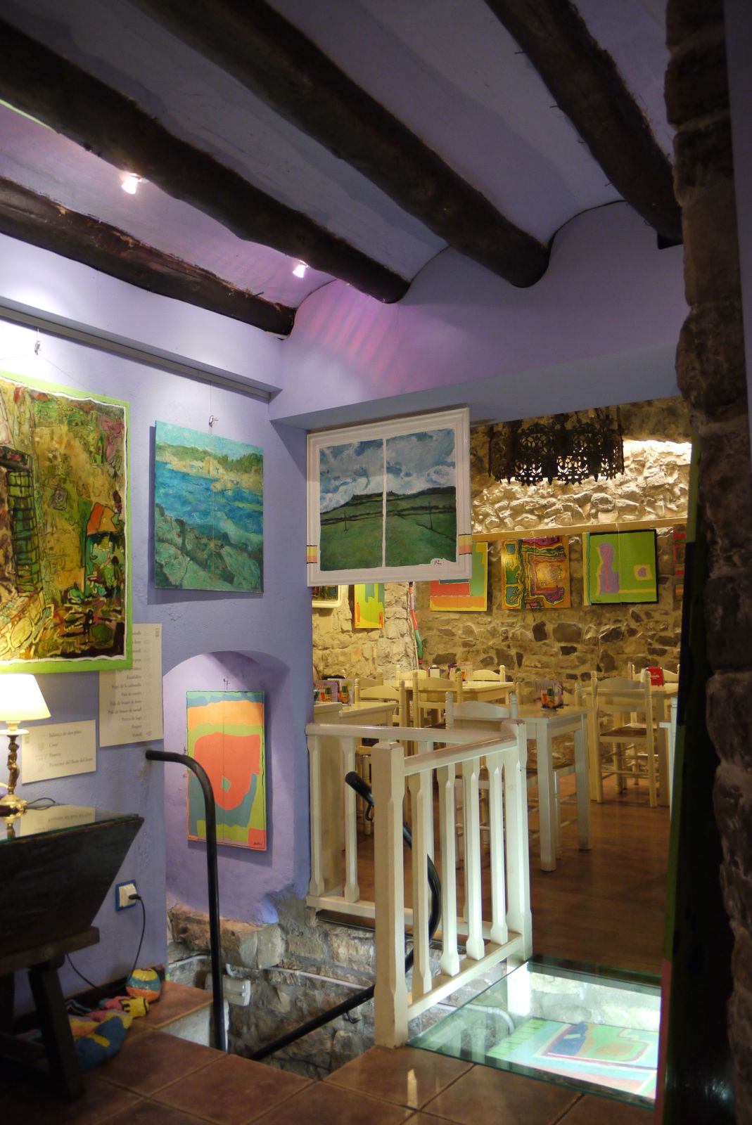 La columna de pedra que marca el canvi de nivell ja dóna la benvinguda a la seva obra per mitjà d’un parell de quadres.