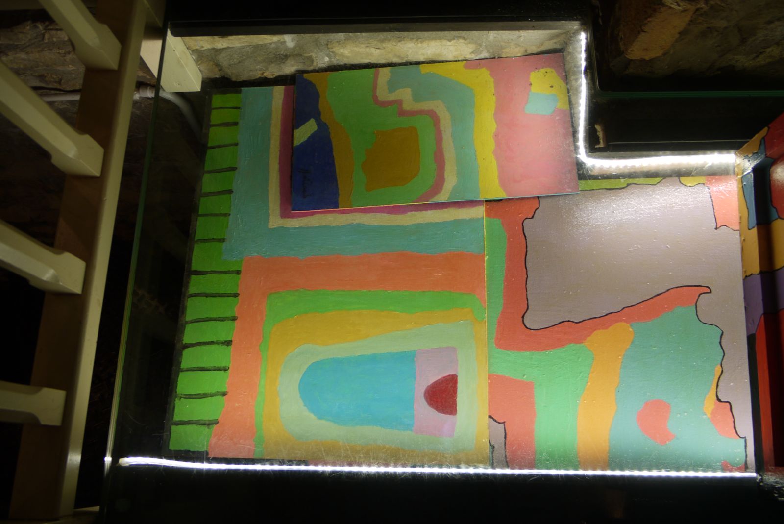 La porta sembla que s’allargui cap al terra. El vidre damunt el que es camina ha quedat “pintat” amb els colors que el Cesc té al terra de la seva llar.