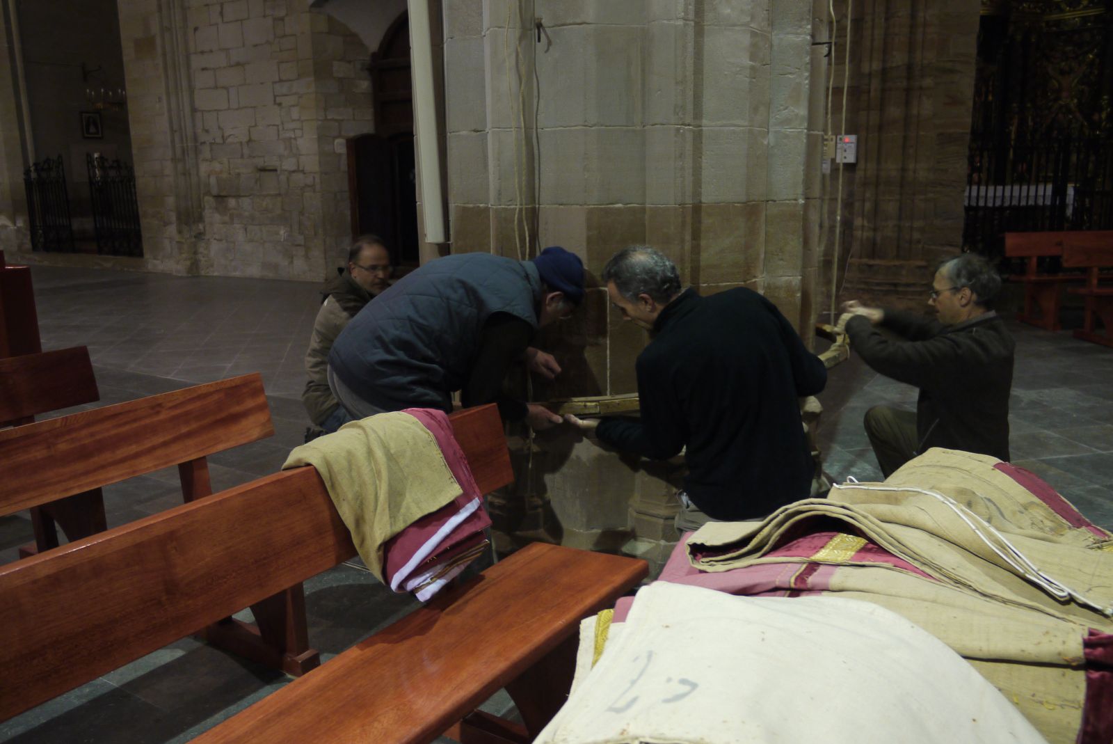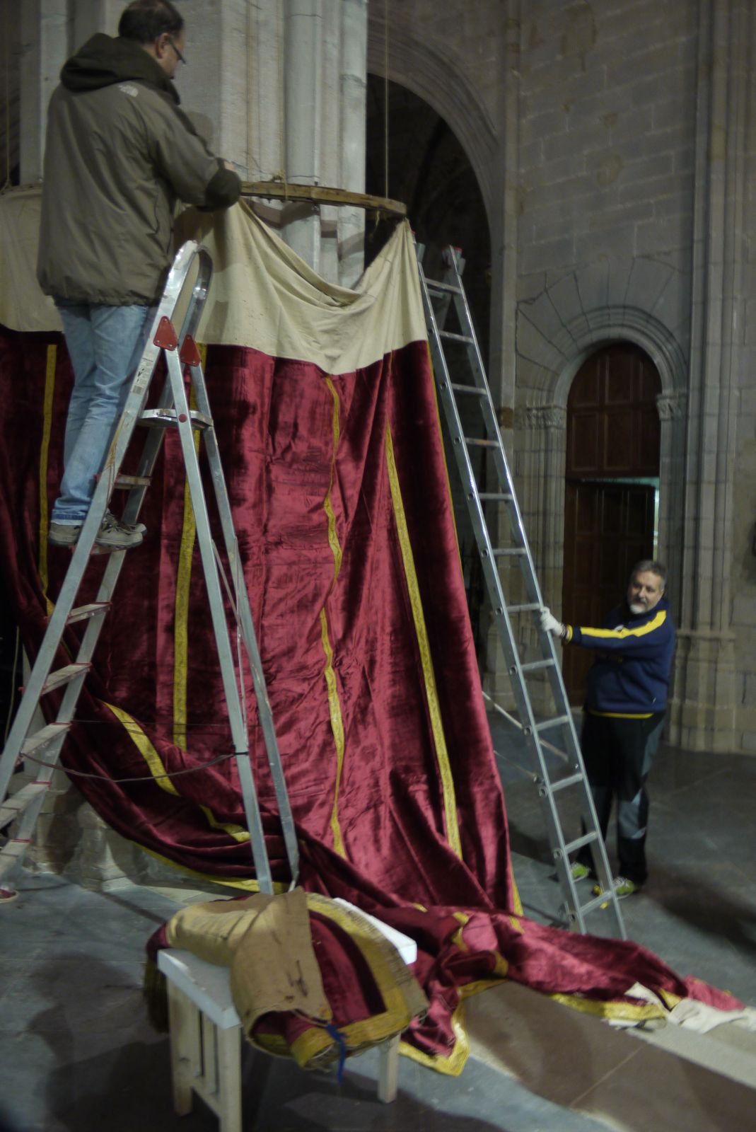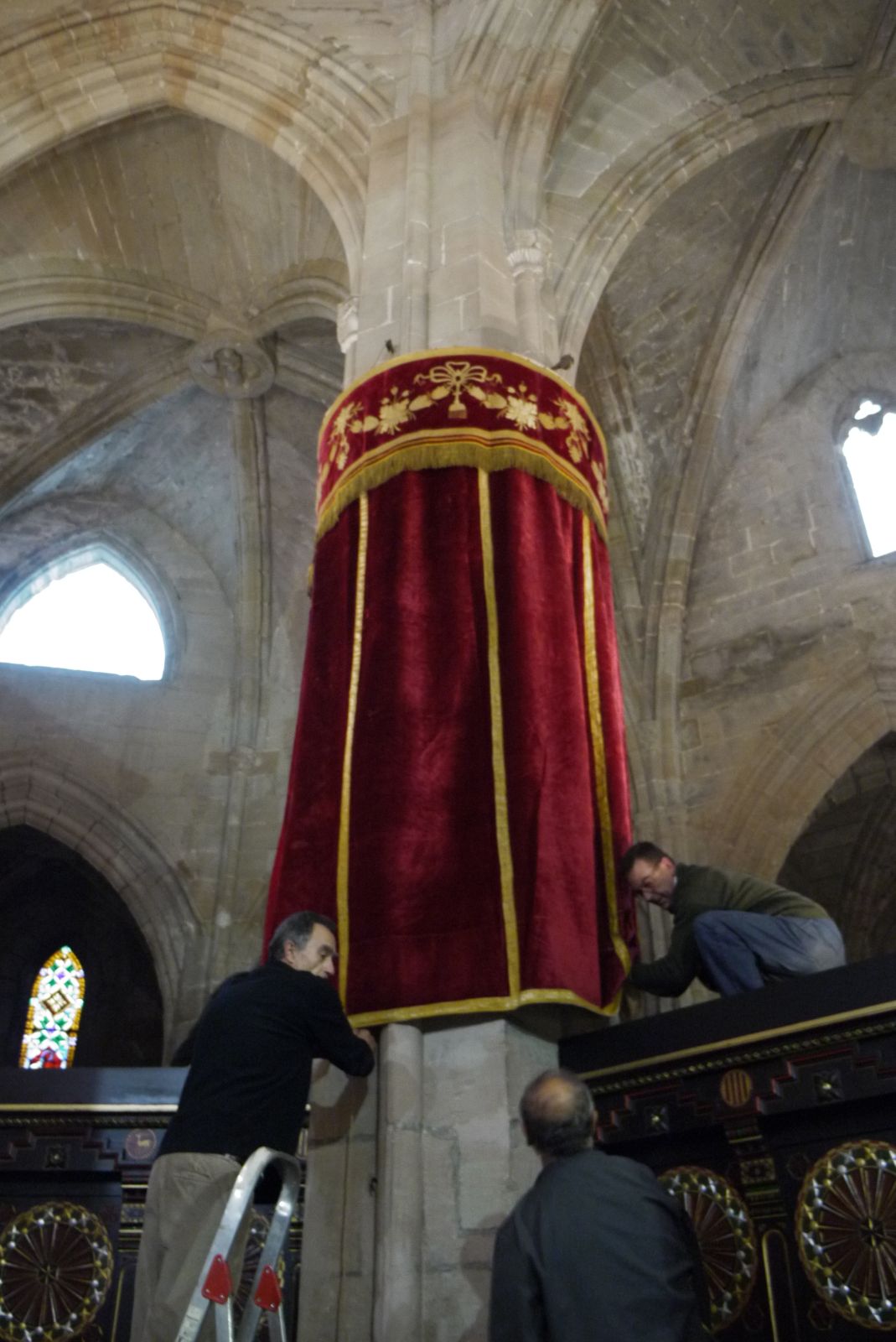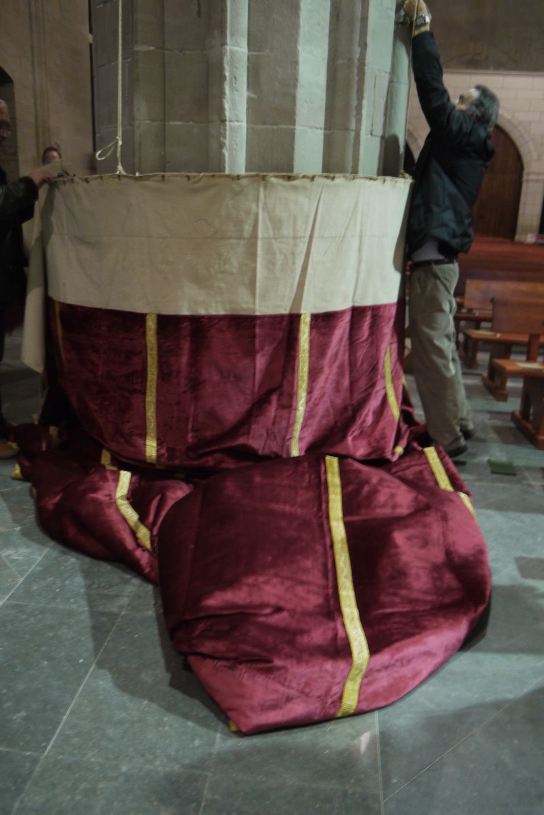Cada any un grup de voluntaris es reuneix a Santa Maria per posar els domassos a les deu columnes del temple gòtic. Mai ho havia vist i vaig pensar que seria interessant fer un reportatge fotogràfic perquè quedés constància de com ho fan. Entrant a la sagristia, a mà dreta, hi ha l’armari on durant tot l’any hi reposen, ben plegats i protegits.