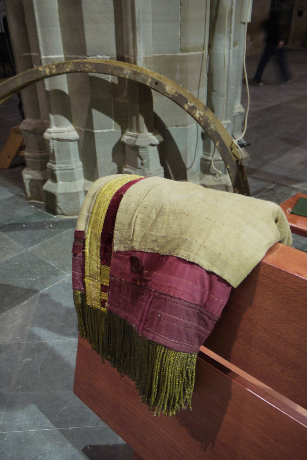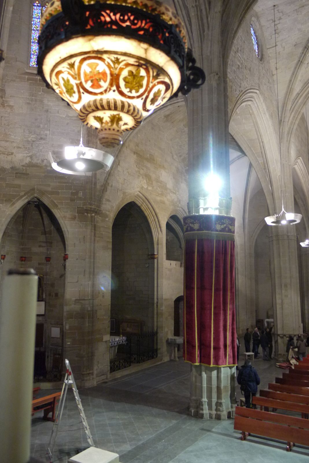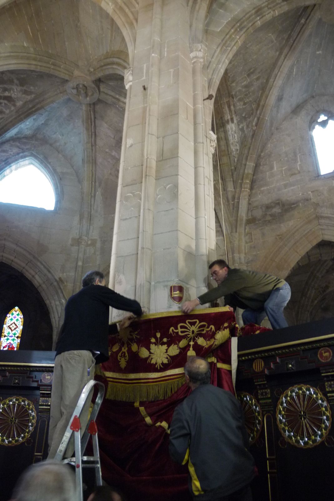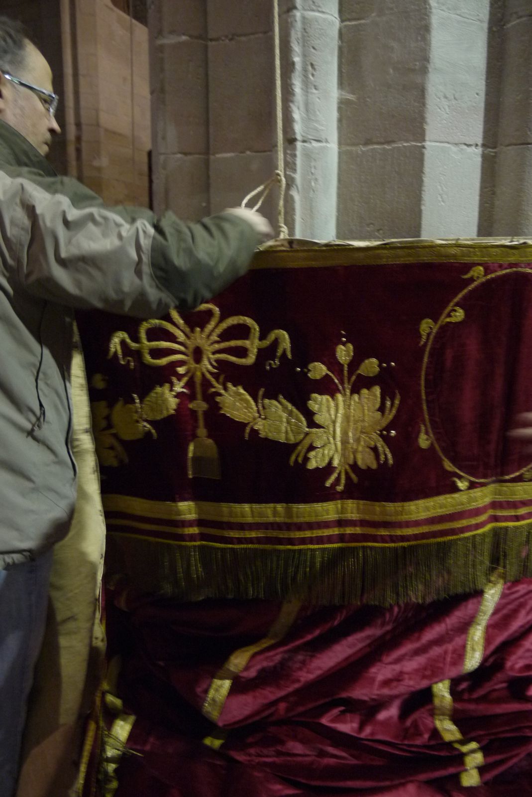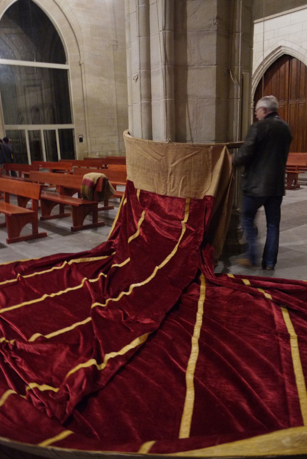 Cada any un grup de voluntaris es reuneix a Santa Maria per posar els domassos a les deu columnes del temple gòtic. Mai ho havia vist i vaig pensar que seria interessant fer un reportatge fotogràfic perquè quedés constància de com ho fan. Entrant a la sagristia, a mà dreta, hi ha l’armari on durant tot l’any hi reposen, ben plegats i protegits.