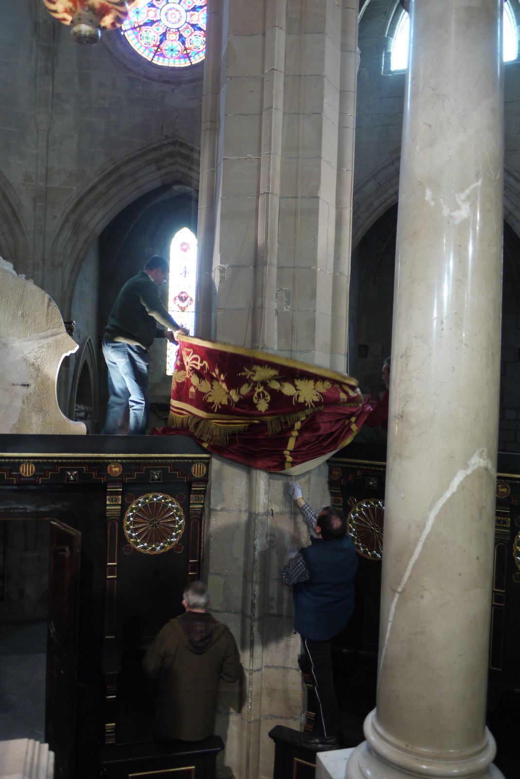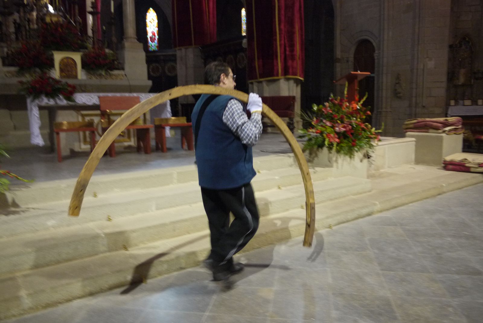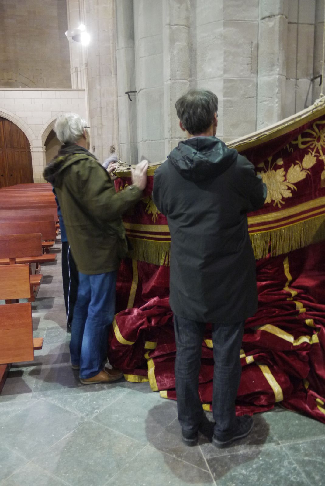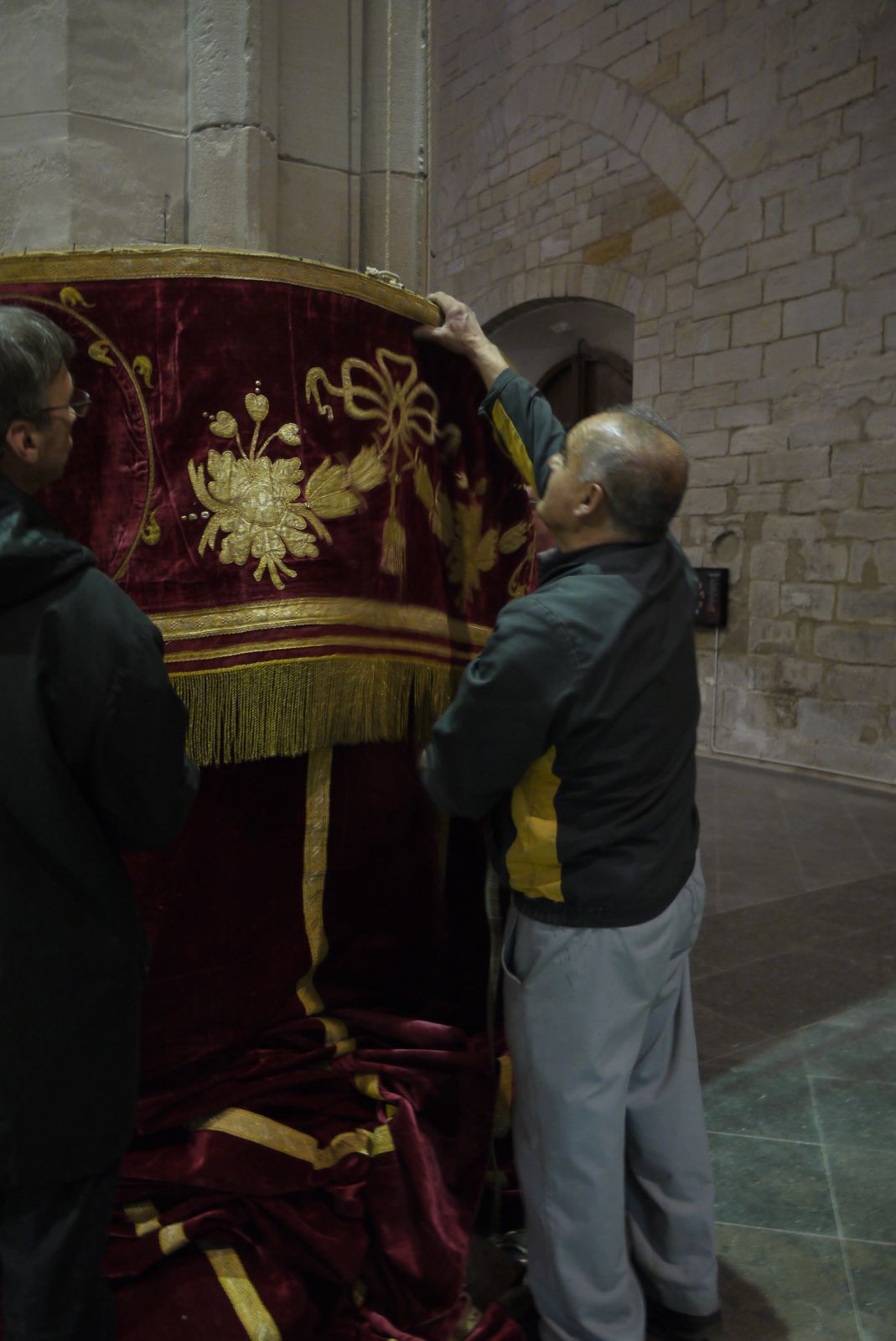 Un cop acabada la Festa Major, el dissabte 8 de febrer a les 4 de la tarda ja van començar a despenjar els domassos. Va passar el que passa sempre amb tot,: que el desmuntar és molt més ràpid que el muntar. Penseu en el pessebre i altres coses. Cal esmerçar-se per fer-les i la feinada és grossa, en canvi per desfer-les es fa molta més via. En aquest cas, tot i que la feina i el risc d’estar penjats, deunidó, es va acabar amb molt menys temps. A mirar com ho fan! Començo amb la imatge d’aquest baldaquí de metall perquè va ser la darrera cosa que van haver de guardar. I per l’esforç que feien sembla que pesava un munt! Només es posa un cop a l’any i és per col·locar-hi el relicari que conté el trosset de Creu quan es deixa a l’altar Major.
