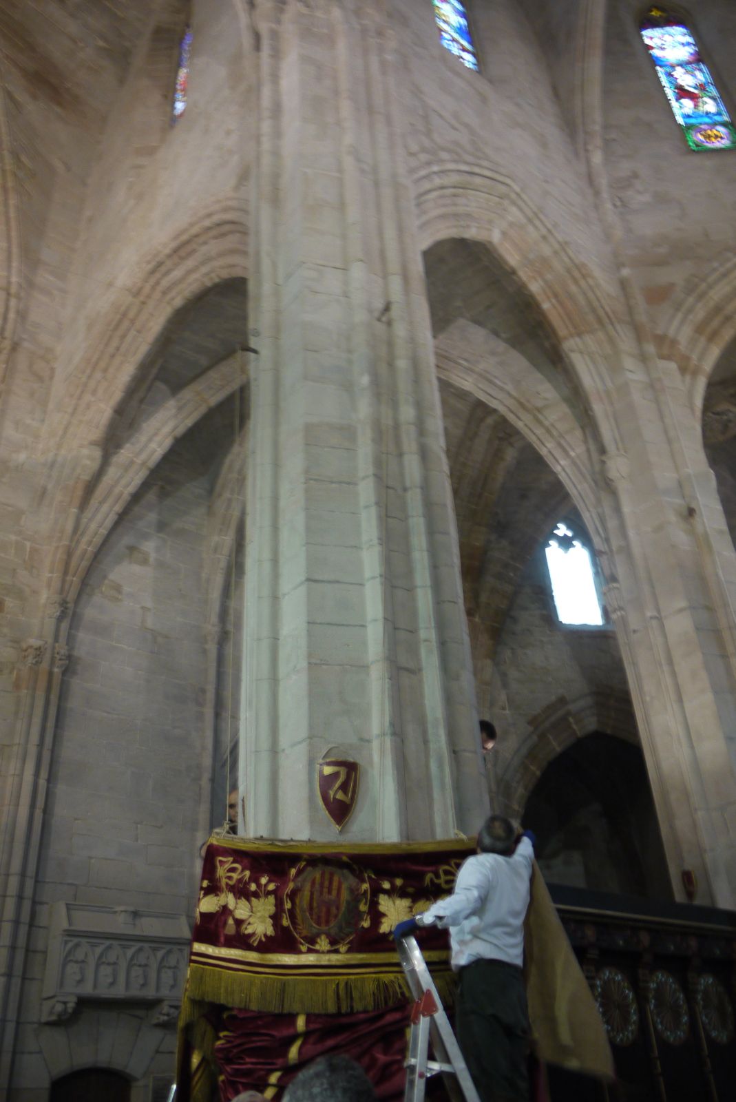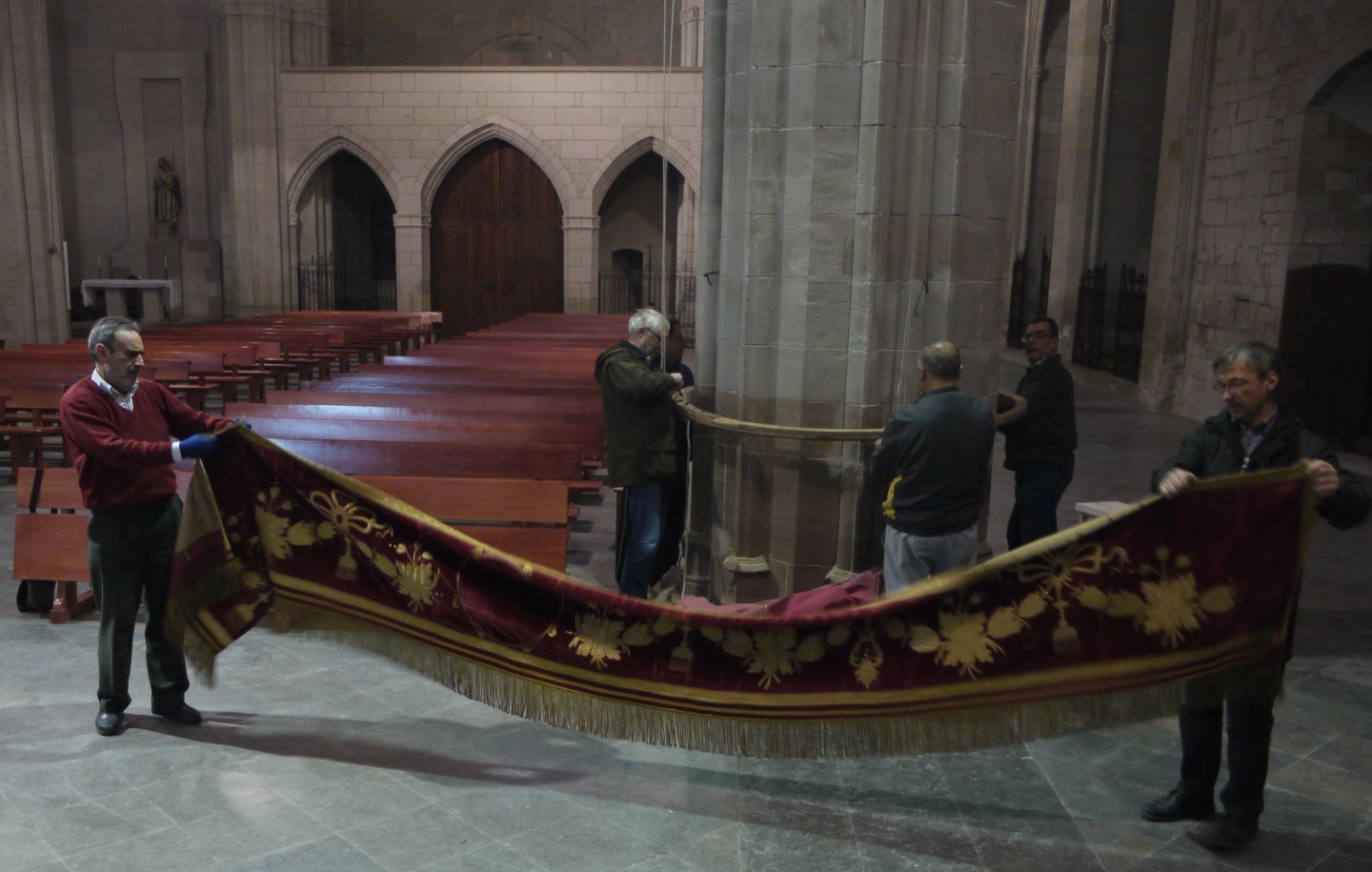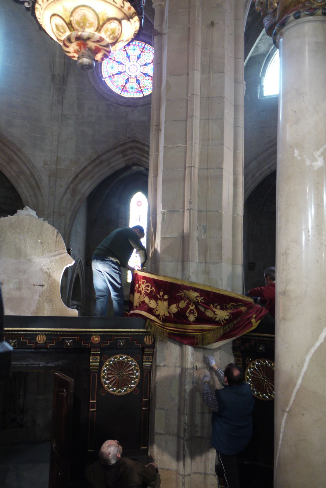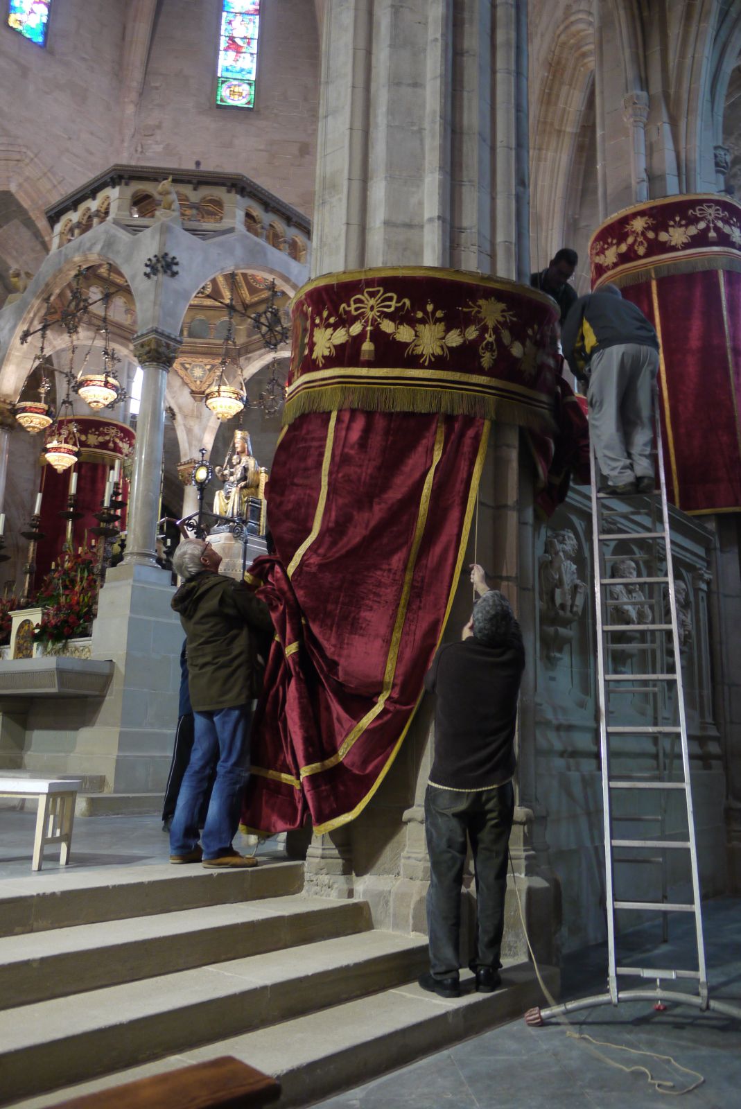 Un cop acabada la Festa Major, el dissabte 8 de febrer a les 4 de la tarda ja van començar a despenjar els domassos. Va passar el que passa sempre amb tot,: que el desmuntar és molt més ràpid que el muntar. Penseu en el pessebre i altres coses. Cal esmerçar-se per fer-les i la feinada és grossa, en canvi per desfer-les es fa molta més via. En aquest cas, tot i que la feina i el risc d’estar penjats, deunidó, es va acabar amb molt menys temps. A mirar com ho fan! Començo amb la imatge d’aquest baldaquí de metall perquè va ser la darrera cosa que van haver de guardar. I per l’esforç que feien sembla que pesava un munt! Només es posa un cop a l’any i és per col·locar-hi el relicari que conté el trosset de Creu quan es deixa a l’altar Major.