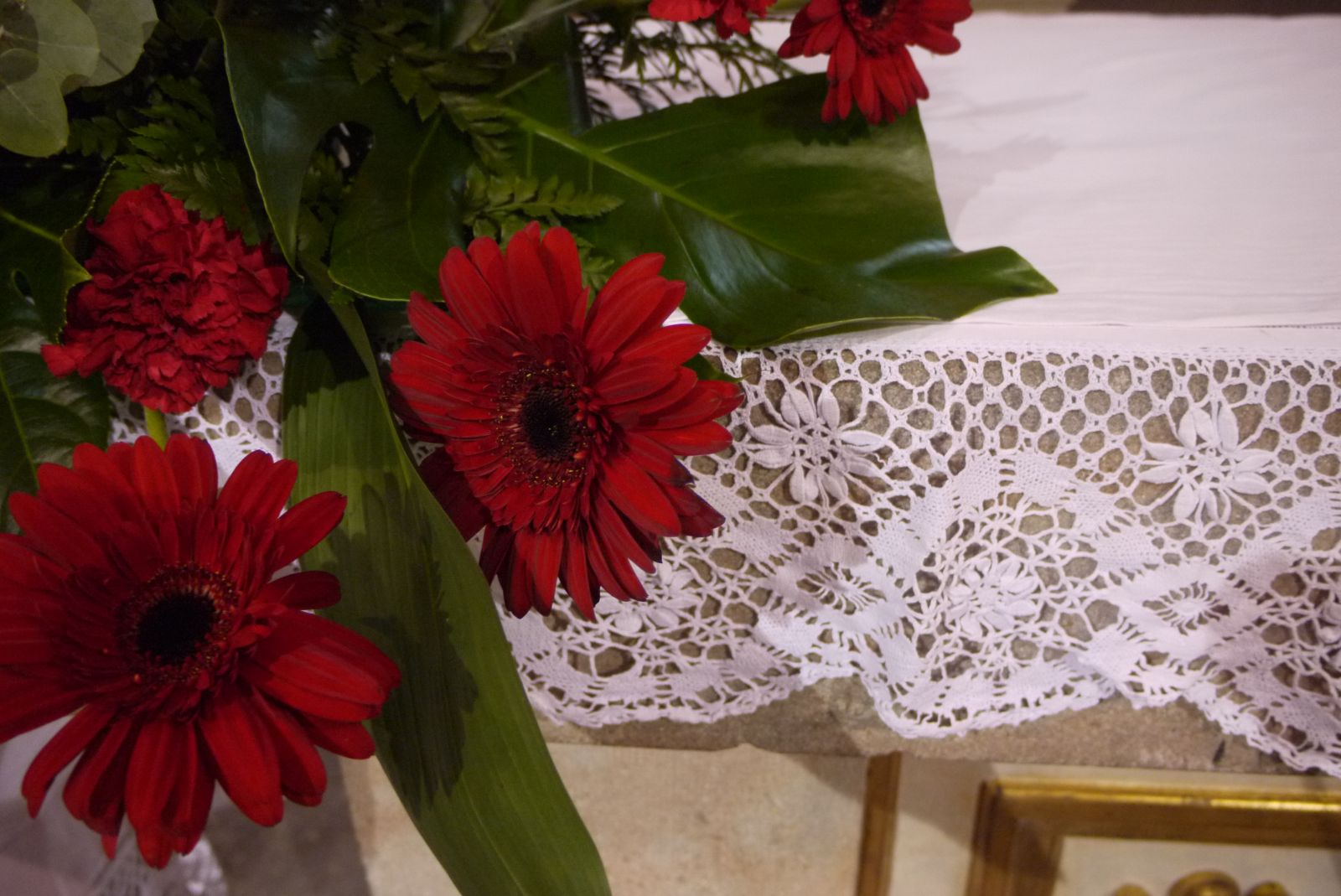 Contrastant amb les flors, podem veure un detall de les estovalles de l’altar amb les garlandes fetes a mà.