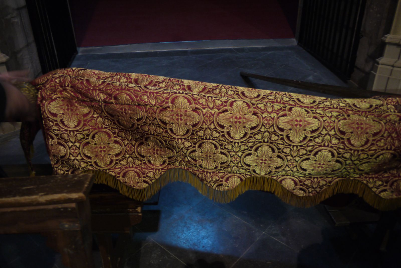 No ens descuidem el tàlem, el que s’ha estrenat aquest any. Aquí es veu força bé la tela de brocat grana i daurada. Cal desmuntant els suports i plegar la roba per poder-ho guardar sense que ocupi massa lloc.
