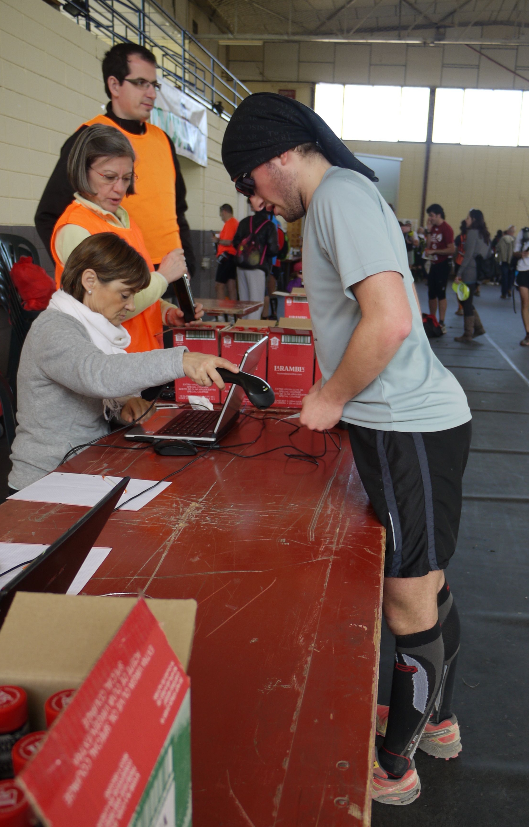 Els primers corredors van arribant i aquest voluntari, que porta el control, els hi demana la identificació. En aquesta imatge en podeu veure tres de voluntaris: el que tenim al davant amb l’armilla taronja, l’un que només se li veu l‘ombra i jo mateixa fent la fotografia.