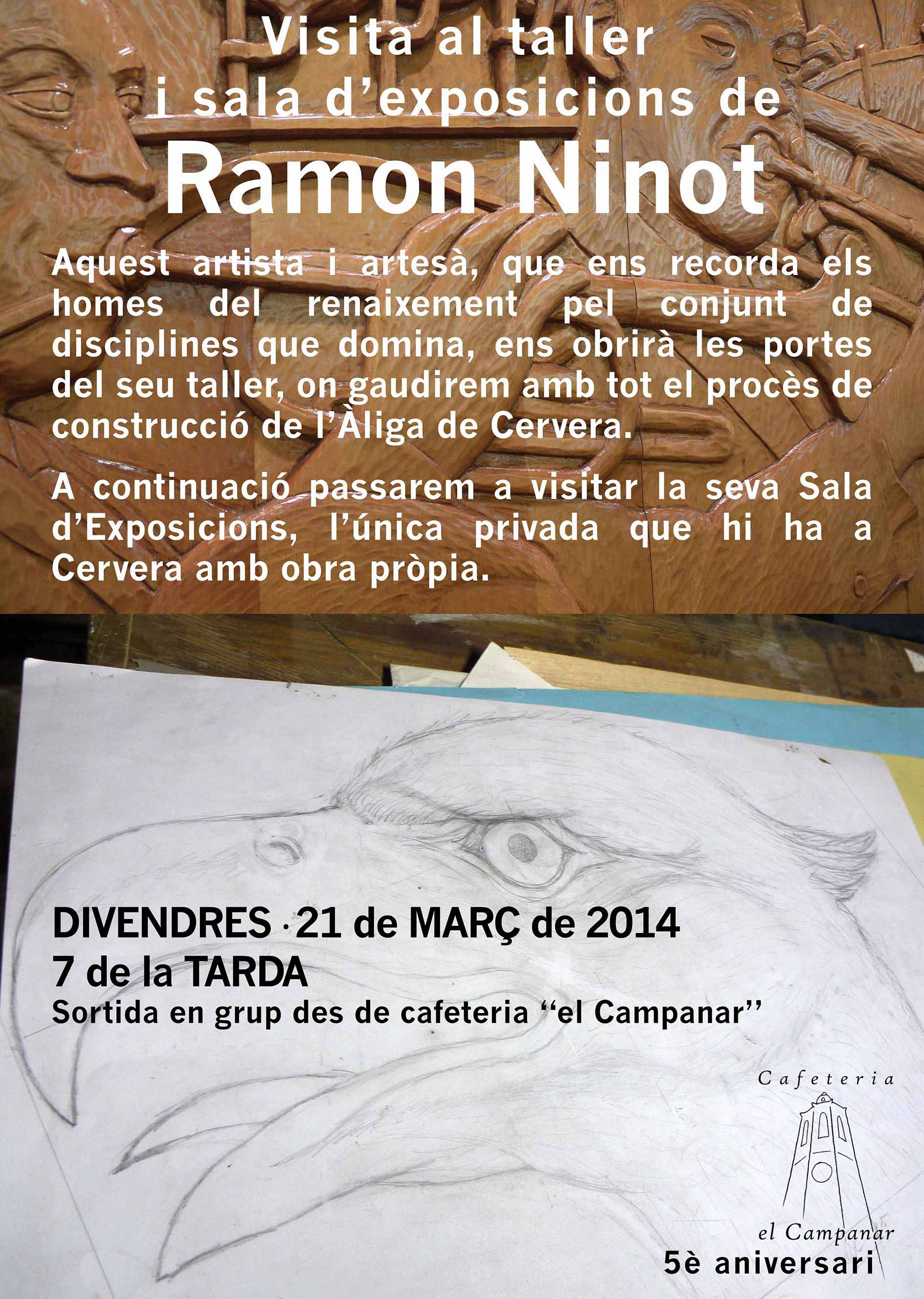 Aquest any Cafeteria “el Campanar” està d’anivesari: fa cinc anys que aquest espai està obert al públic. S’han programat diferents activitats de caire lúdic per tal de celebrar-ho. Aquesta visita al taller de Ramon Ninot és la segona que s’ha dut a terme.