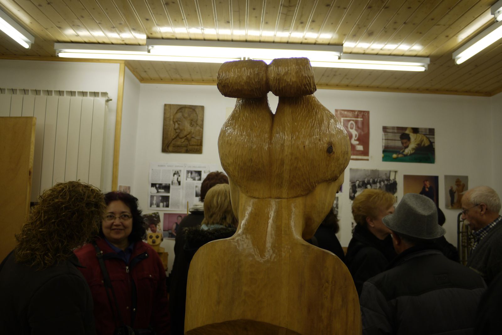 Passem a la Sala d’Exposicions. A l’obrir les portes veiem un impactant mural fet amb fusta, al fons, i al bell mig de l’espai, una altra escultura també feta en pedra de la mateixa jove que havíem trobat a l’entrada. Hi ha una fotografia seva a la paret i la podem reconéixer: és l’Imna Durán de Cervera, quan tenia uns disset anys.
