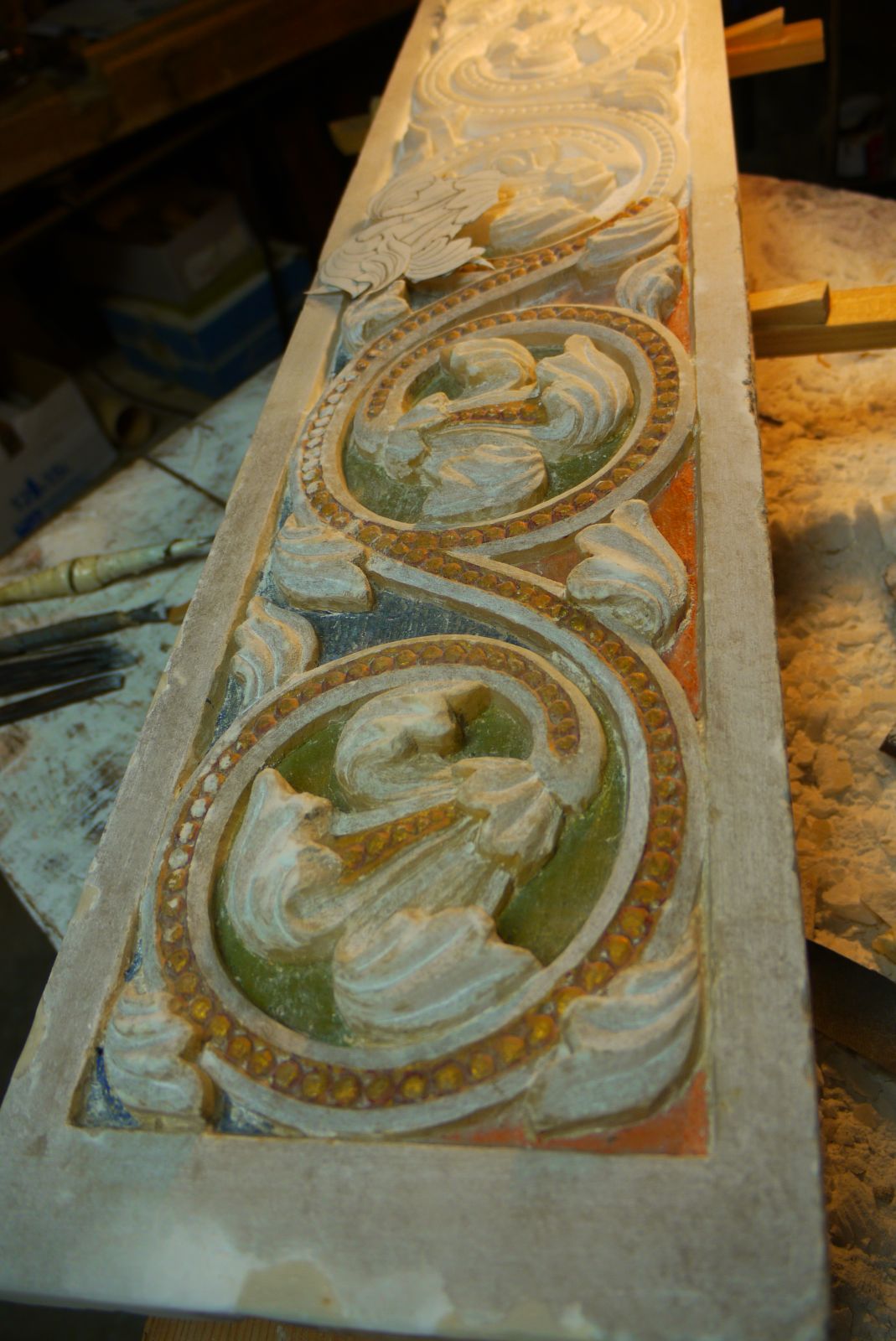En que està treballant ara aquest artista? Va ser una sorpresa veure un tros d’alabastre procedent de la sanefa que hi ha a l’altar de l’església de Santa Maria. La part pintada és l’ original i la resta és la part que s’havia malmés i que ell està referent a partir d’un tros nou d’alabastre. Un treball minuciós i detallista que s’ha encarregat a qui millor ho podia fer.