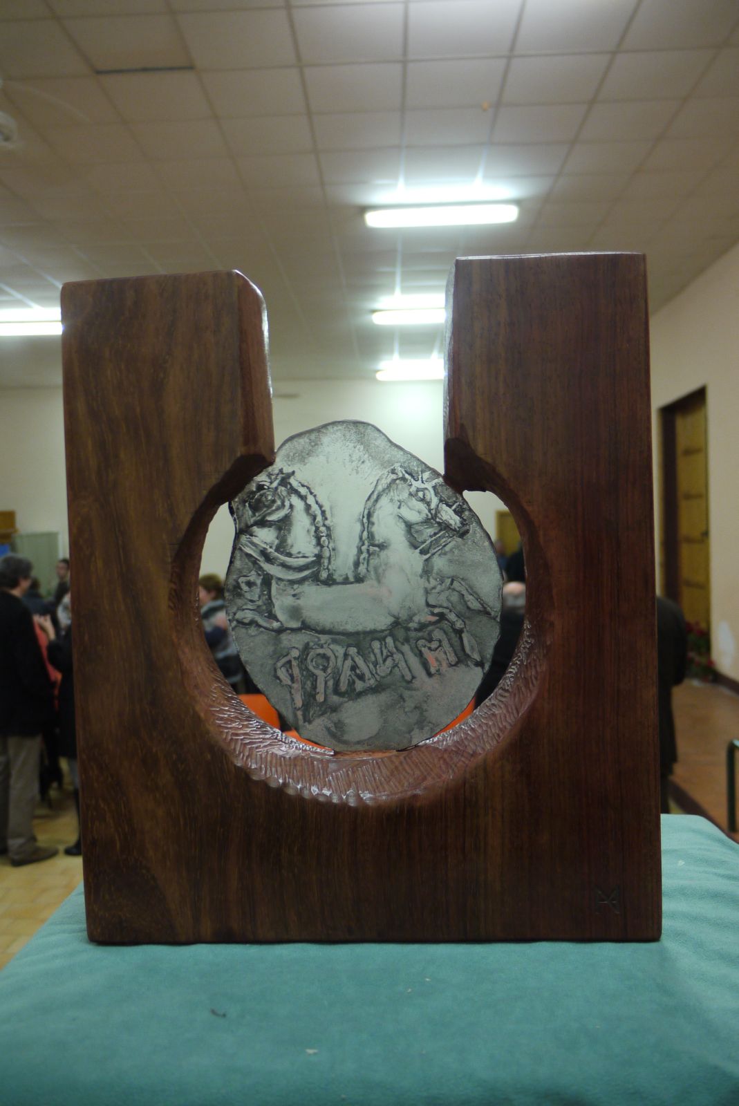 L’obra reprodueix en una grisalla el motiu del revers de la moneda Sikarra i està integrada dins el perfil d’una espitllera de fusta. És una escultura de l’artista Anna Marín–Gálvez titulada “Esguard alliberat”.
