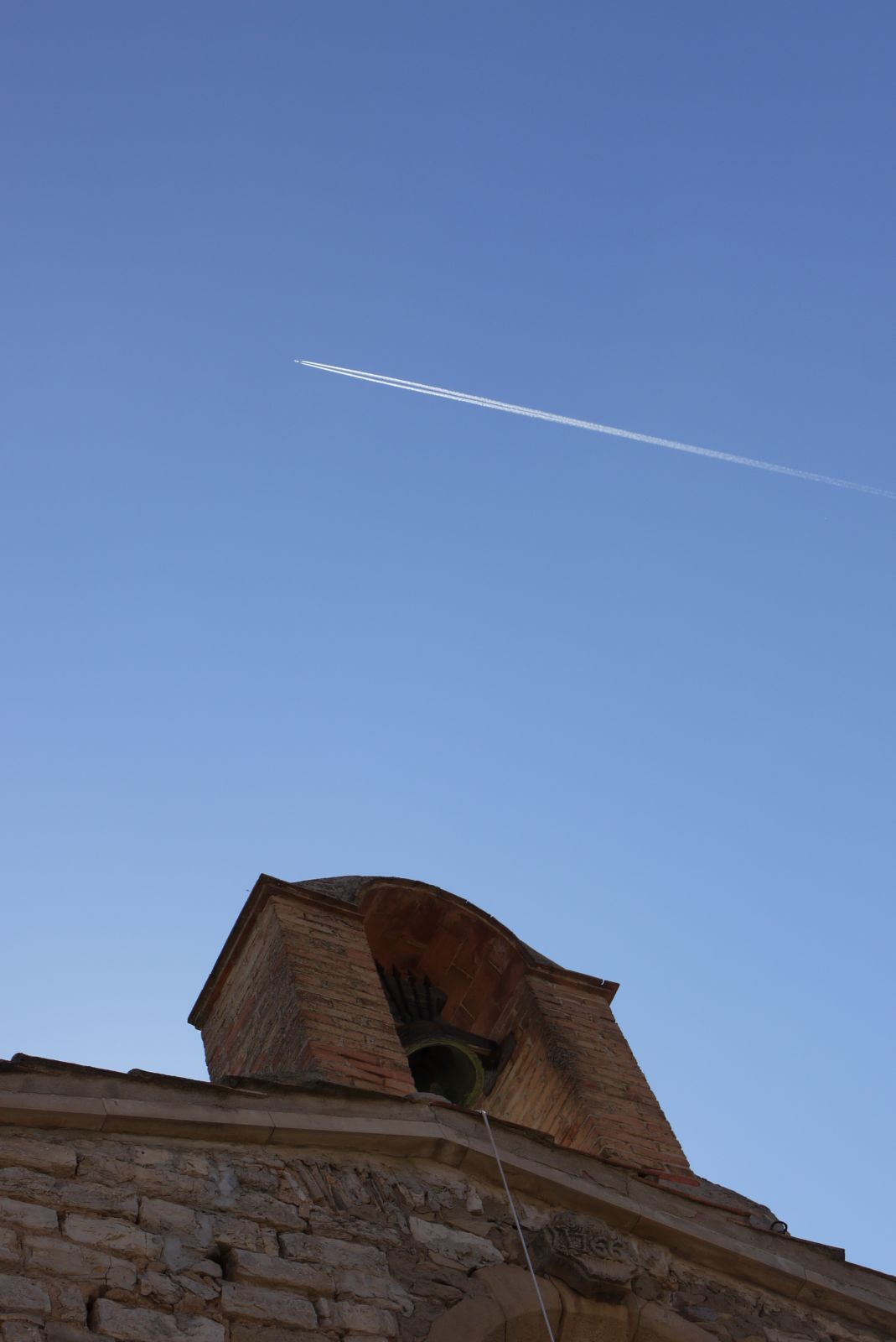 El campanar, amb una sola campana, aixeca la mirada enlaire tot i contemplant l’estela d’un avió que deixa rastre.