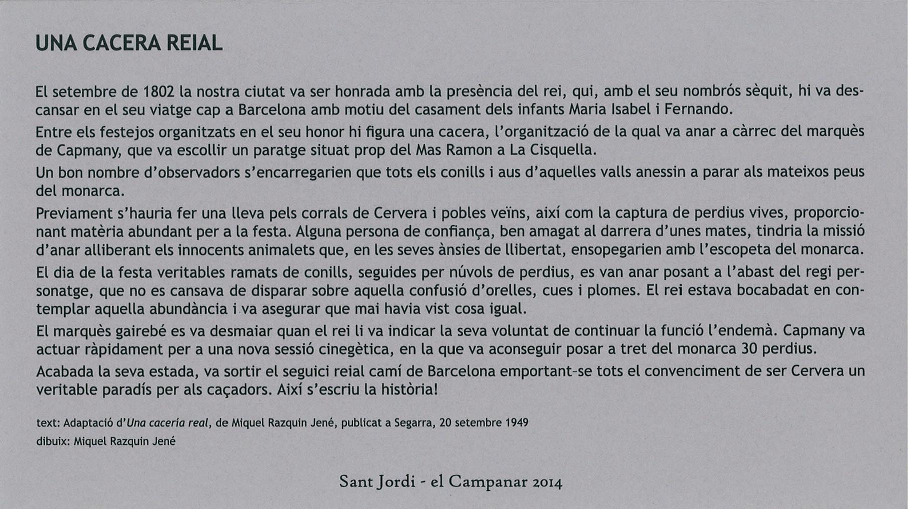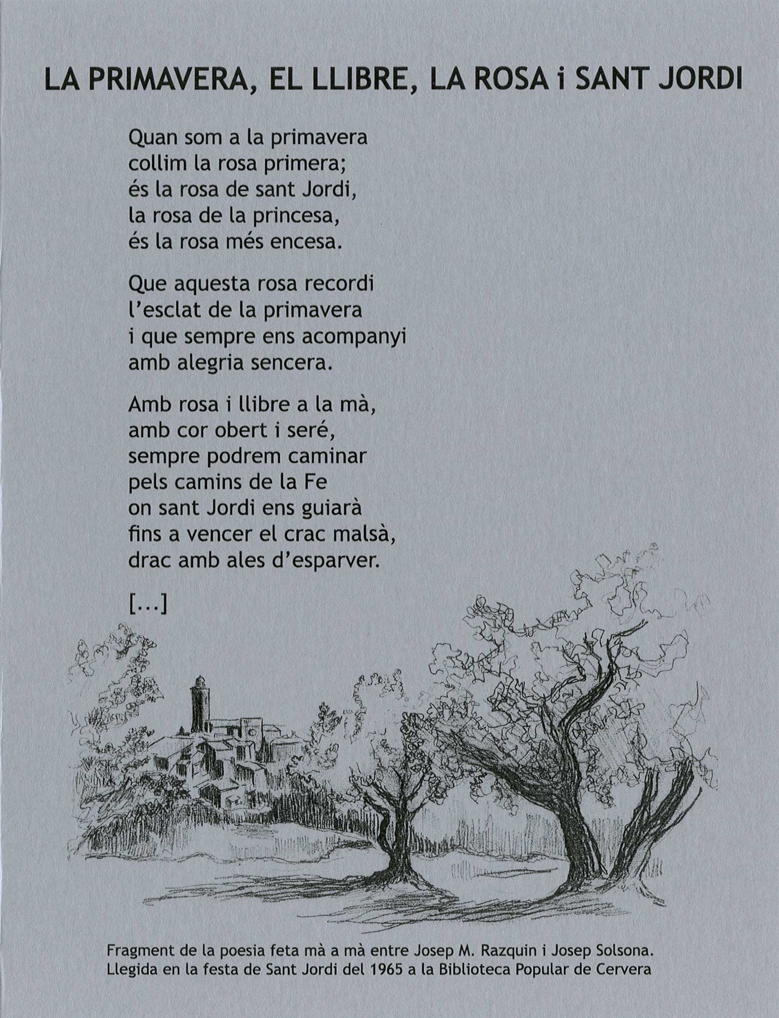 Des de “el Campanar”, per Sant Jordi, es recoden figures d’escriptors i poetes cerverins. Aquest any els protagonistes han estat els germans Miquel i Josep Mª Razquin. Es recordà la vessant d’escriptors però especialment l’habilitat ioriginalitat respecte a la pintura i al dibuix que van desenvolupar aquests dos germenas al llarg de la seva vida.