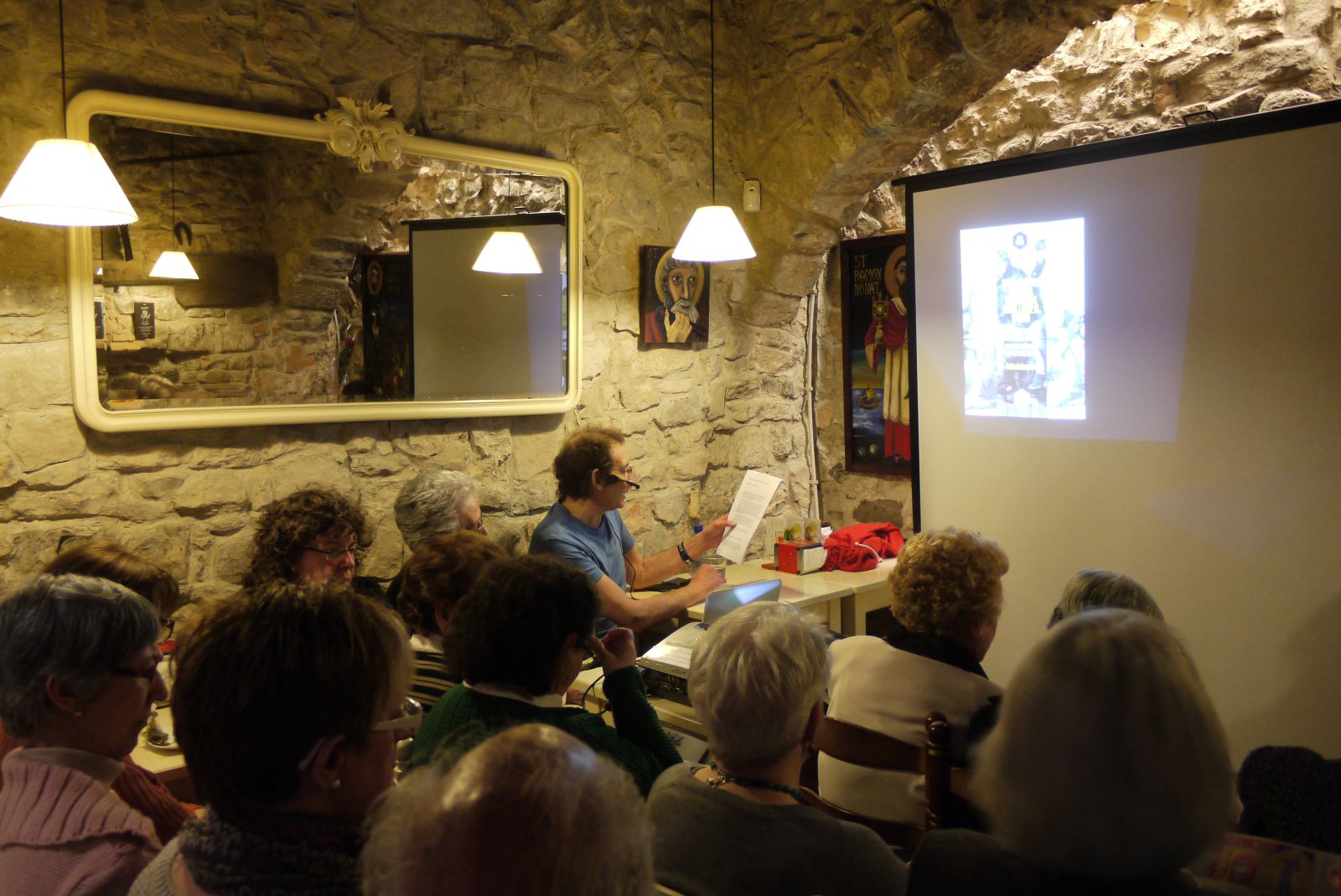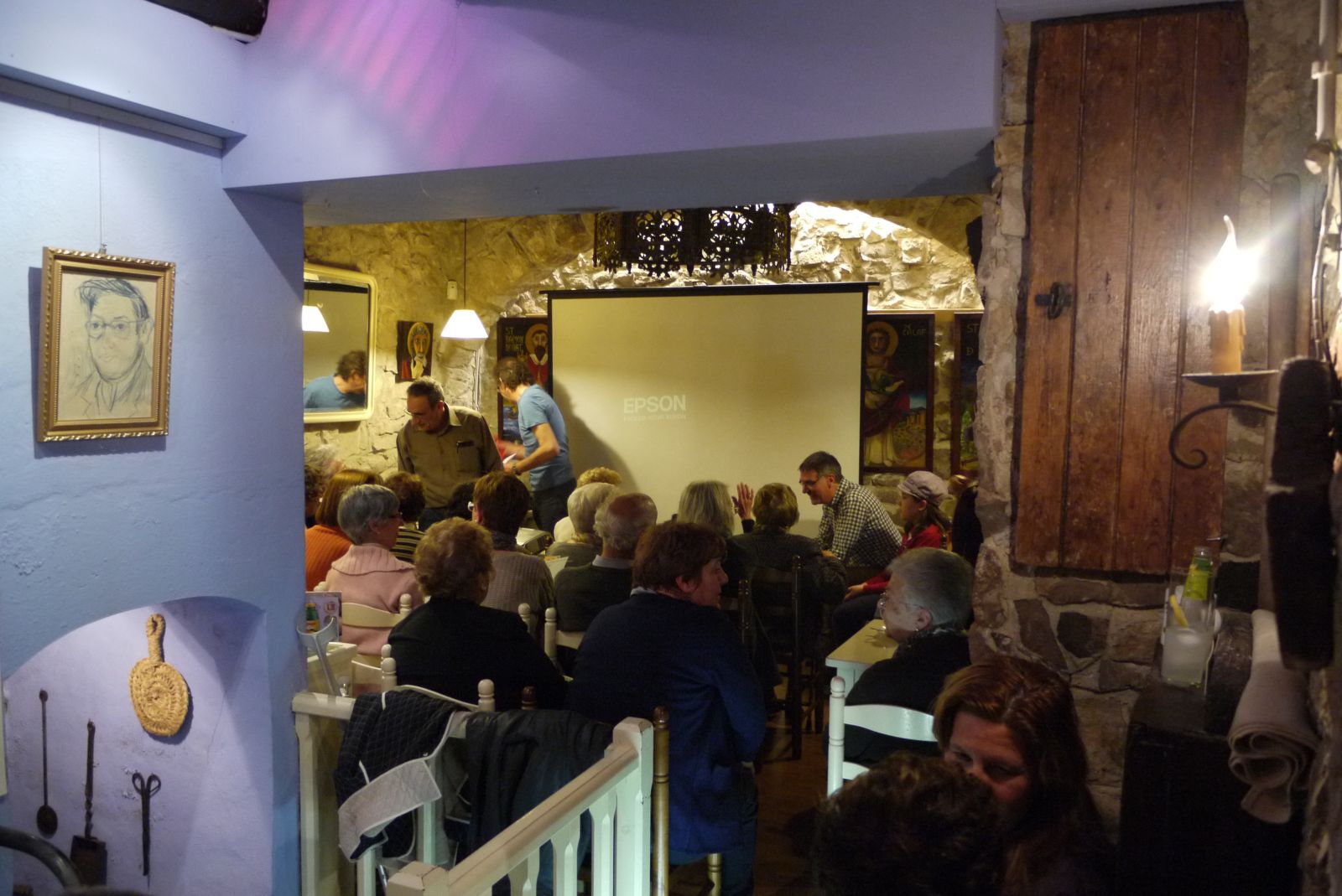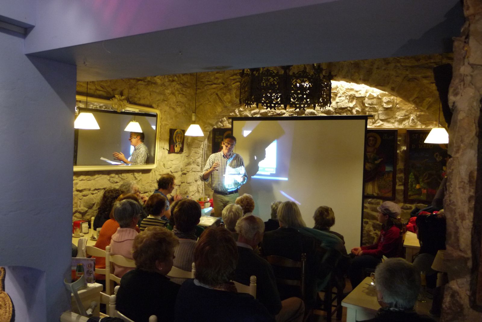 Ramon M. Razquin, fill i nebot dels protagonistes, va ser l’encarregat de fer la conferència. Aquí el podem veure amb Josep Mas preparant el muntatge per passar les imatges que havia preparat.